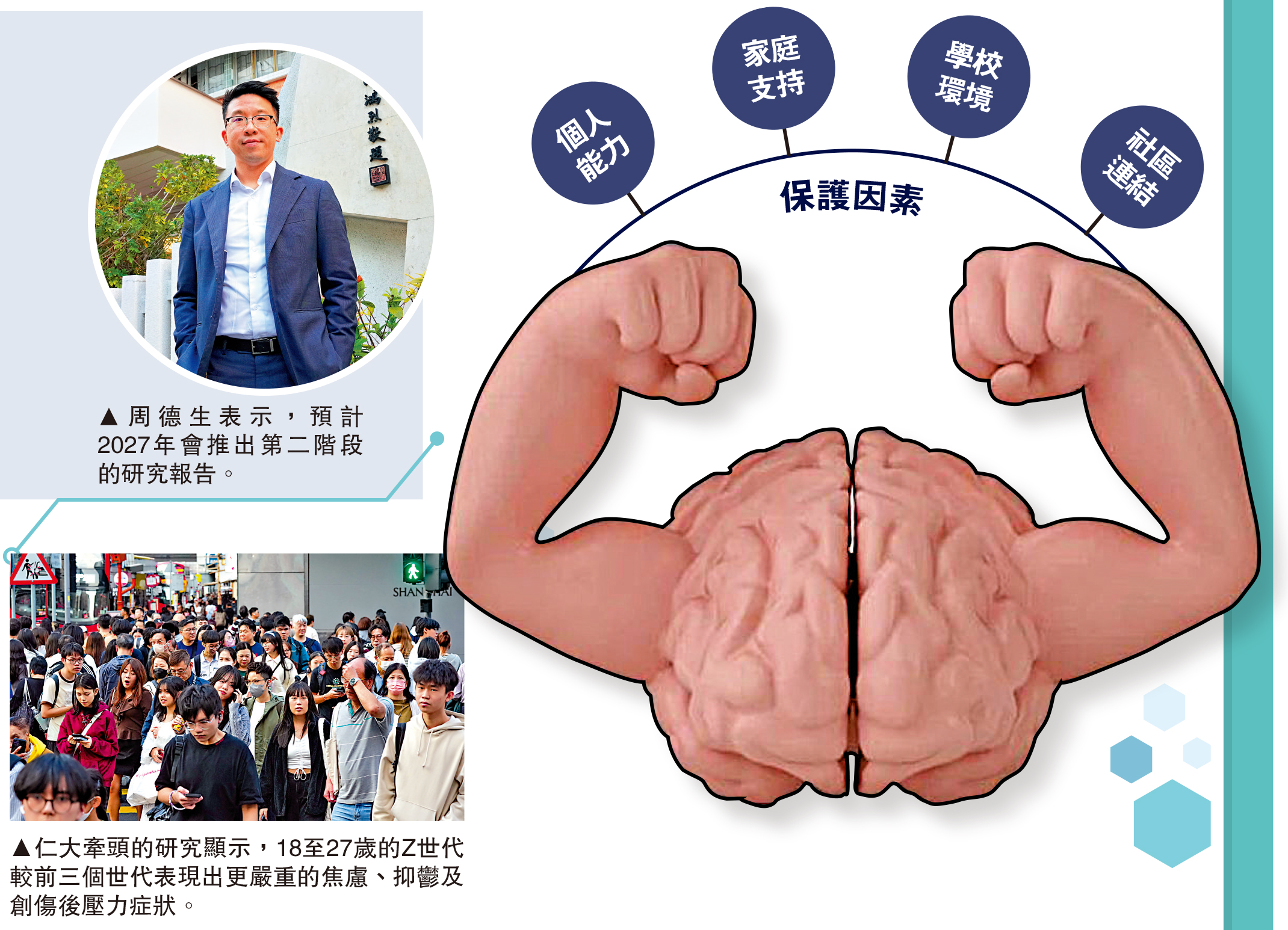周德生表示,香港Z世代的抗逆能力相對較低,亦與國際趨勢相符。而抗逆能力較低的背後原因,與保護因素有關。周博士解釋,保護因素是指能降低個人面臨風險(如壓力、精神疾病)並提升復原力的正面特質、環境與支持系統,涵蓋個人能力(如樂觀)、家庭支持(如父母關愛)、學校環境(如師長信任、同儕友誼)及社區連結,幫助人們在困境中保持健康並成功應對挑戰。「我們發現Z世代尤其在情緒調節能力,和積極的人生觀這兩方面,其數據較其他三個世代為低。」其中,情緒調節被認為是最強的保護因素。