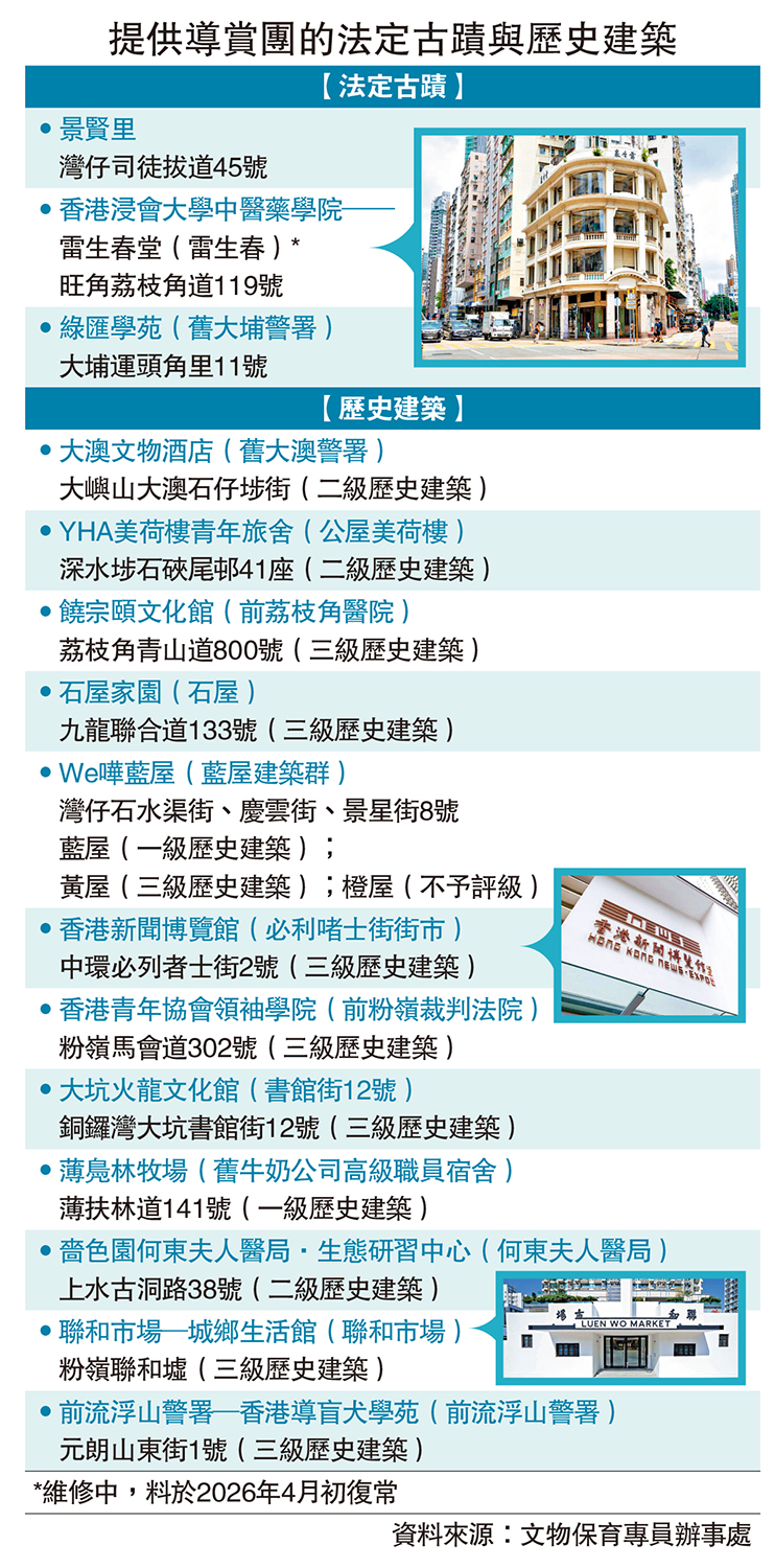 藍屋(一級歷史建築);黃屋(三級歷史建築);橙屋(不予評級)