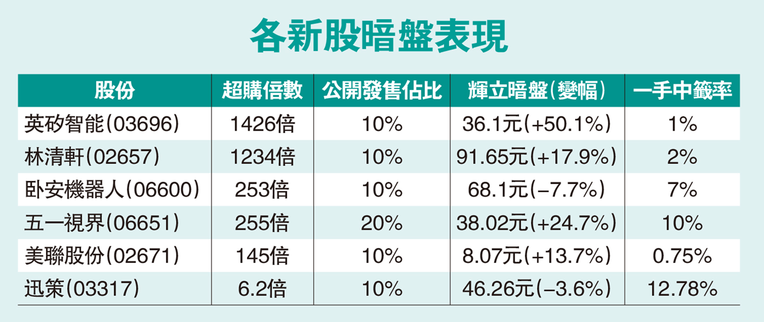 另外,美聯股份及卧安機器人分別錄得超額認購145倍、253倍,惟暗盤市場的表現各異,前者錄得13.7%至23.9%升幅,後者則下跌7.6%至8.7%。另外,迅策表現平平,暗盤價由升2%至跌8.3%。