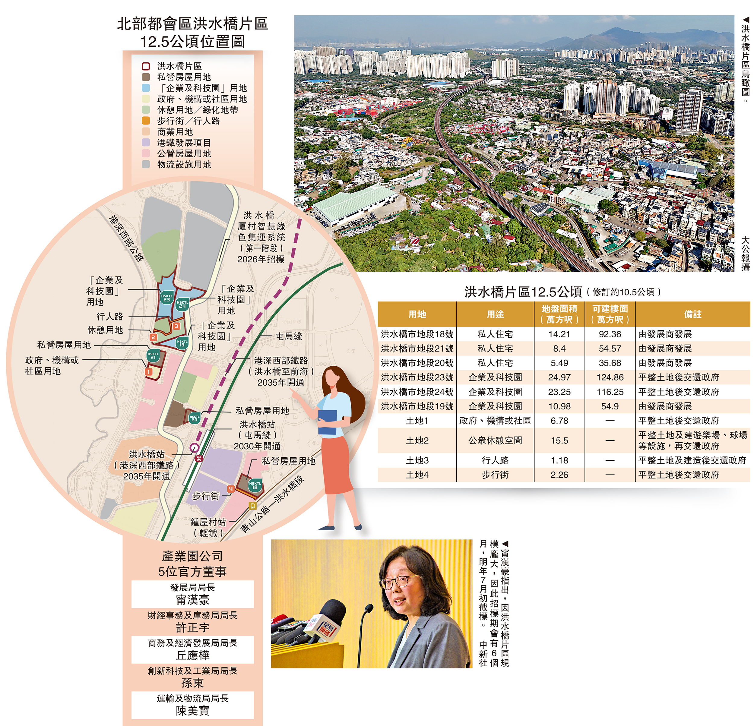 特區政府加快北部都會區的發展速度,現先以片區開發的發展模式,率先推出洪水橋新區內1幅廣達約10.5公頃土地於今日正式採雙信封制模式招標,借助私人市場力量共同開發產業及住宅土地。與此同時,昨又公布成立洪水橋產業園有限公司(產業園公司),負責發展和營運洪水橋約23公頃的產業園,特區政府明年初落實注資起始資金安排,目標是在明年中便正式投入運作(詳見另稿)。\大公報記者 樓向陽