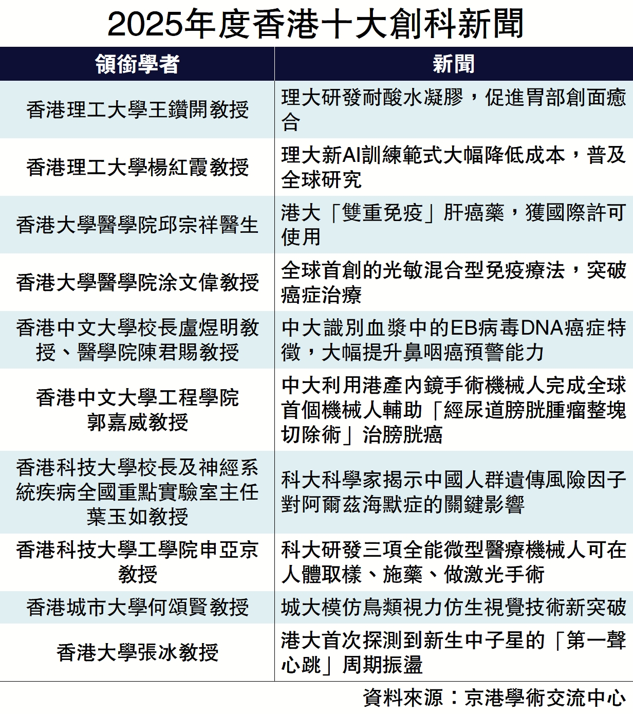 【大公報訊】京港學術交流中心主辦的「2025年度香港十大創科新聞評選」結果出爐,逾4000名來自大專、科研、教育界等各界人士,以網上投票方式選出心目中的十大創科新聞。與大眾健康密切相關的醫療健康獨佔6則,分別來自香港大學、香港中文大學和香港科技大學;應用前景廣泛的仿生材料、推動全球研究的人工智能訓練新範式亦是寵兒。