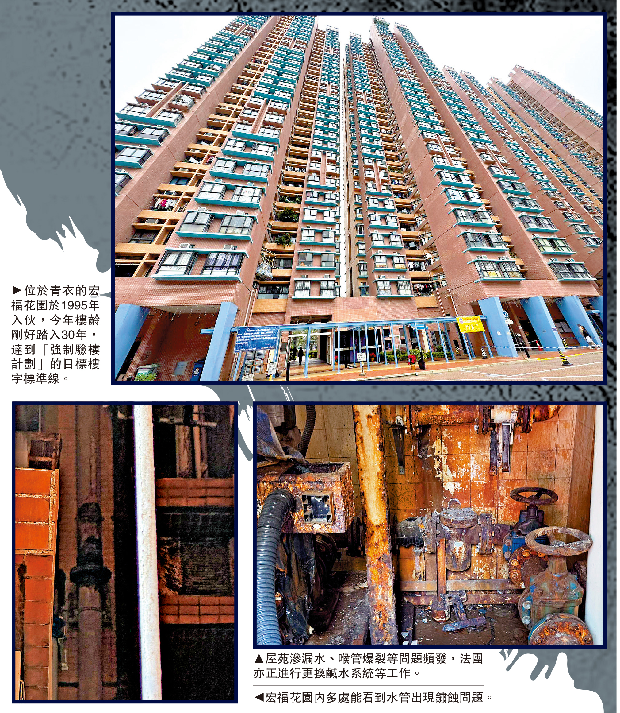 「過去四年,我們已經做了很多不同的維修工程,小修小補的工作幾乎每個月也在進行。」業主立案法團主席黃國忠接受《大公報》訪問時表示,宏福花園過去一直由房協作為公契經理人負責管理,直至四年前,屋苑成立業主立案法團,「法團接手後發現,屋苑維修問題多多,已經隨即更換電梯、車路閘機、門禁系統,參加水安全計劃、更換鹹水系統等,但不斷修補的效率太低,實在難以應對。」