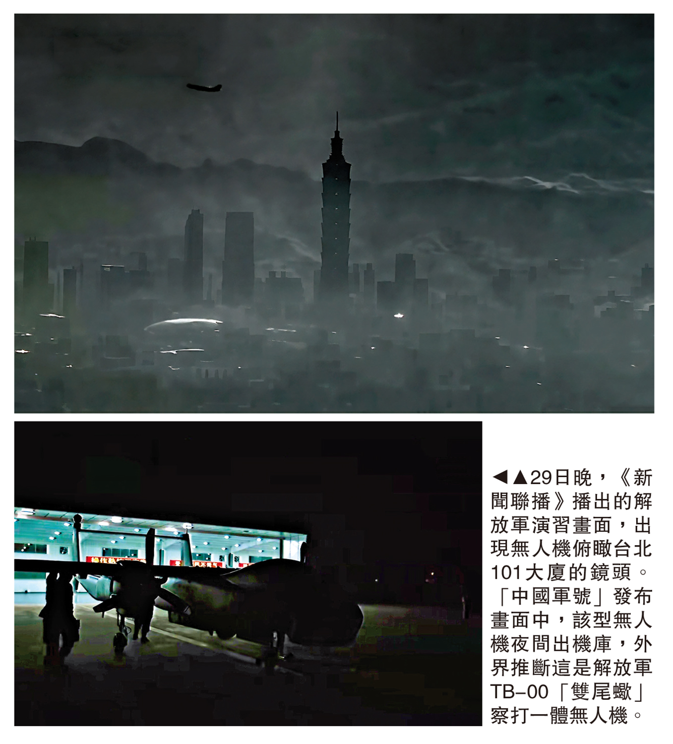 圍島遏「獨」,正義使命。29日晚《新聞聯播》播出的解放軍演習畫面,出現解放軍無人機俯瞰台北101大廈的鏡頭,引起各方高度關注。早前「中國軍號」發布畫面中,該型無人機夜間出機庫,推斷該無人機應為解放軍TB-001「雙尾蠍」察打一體無人機。