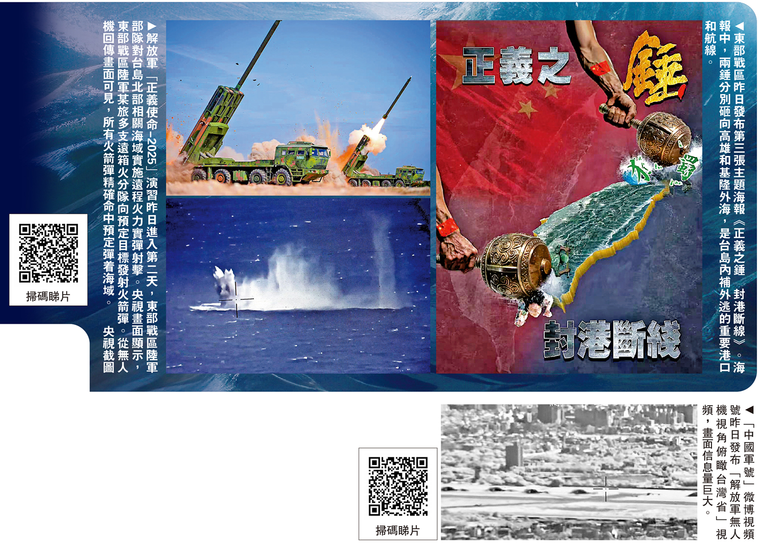 繼《正義之盾 破限除妄》《正義之箭 內控外驅》後,東部戰區昨日發布第三張主題海報《正義之錘 封港斷線》。軍事專家分析指出稱,海報中兩錘分別砸向高雄和基隆外海,是台島內補外逃的重要港口和航線,一旦被切斷,島內很快會亂作一團。\大公報記者 朱燁北京報道
