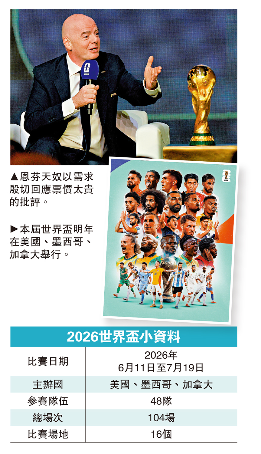 【大公報訊】據新華社報道:在2026年美加墨世界盃門票因定價過高引發爭議後,國際足聯主席恩芬天奴29日表示,自最新一輪門票抽籤登記12月中旬開始以來,已收到超過1.5億份購票申請,遠超紀錄。