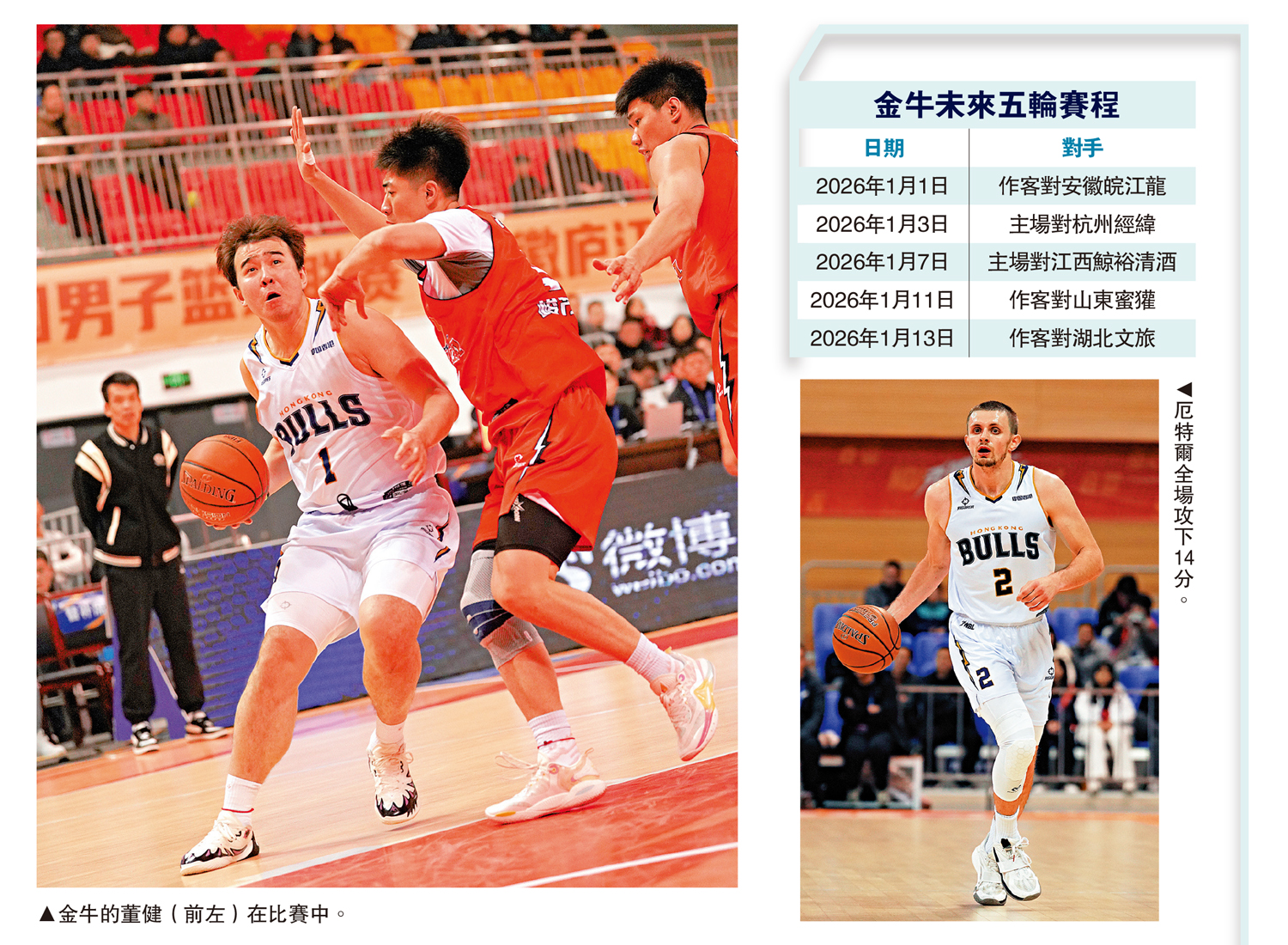 香港金牛今季繼續強勢出擊,過去兩輪比賽已經先後作客擊敗貴州猛龍及主場贏上海玄鳥錄得連捷;合肥狂風是金牛球星阿諾斯克的前球會,當時阿諾斯克更成為得分王,狂風今季亦已擊敗安徽皖江龍、杭州經緯及江西鯨裕清酒連贏3場。金牛今仗希望以一場勝利完美結束2025年,他們的正選陣容包括兩名外援美國後衛厄特爾及捷克中鋒巴爾文,其餘位置有前鋒盧藝文及唐才育,夥拍另一後衛孫晨然。