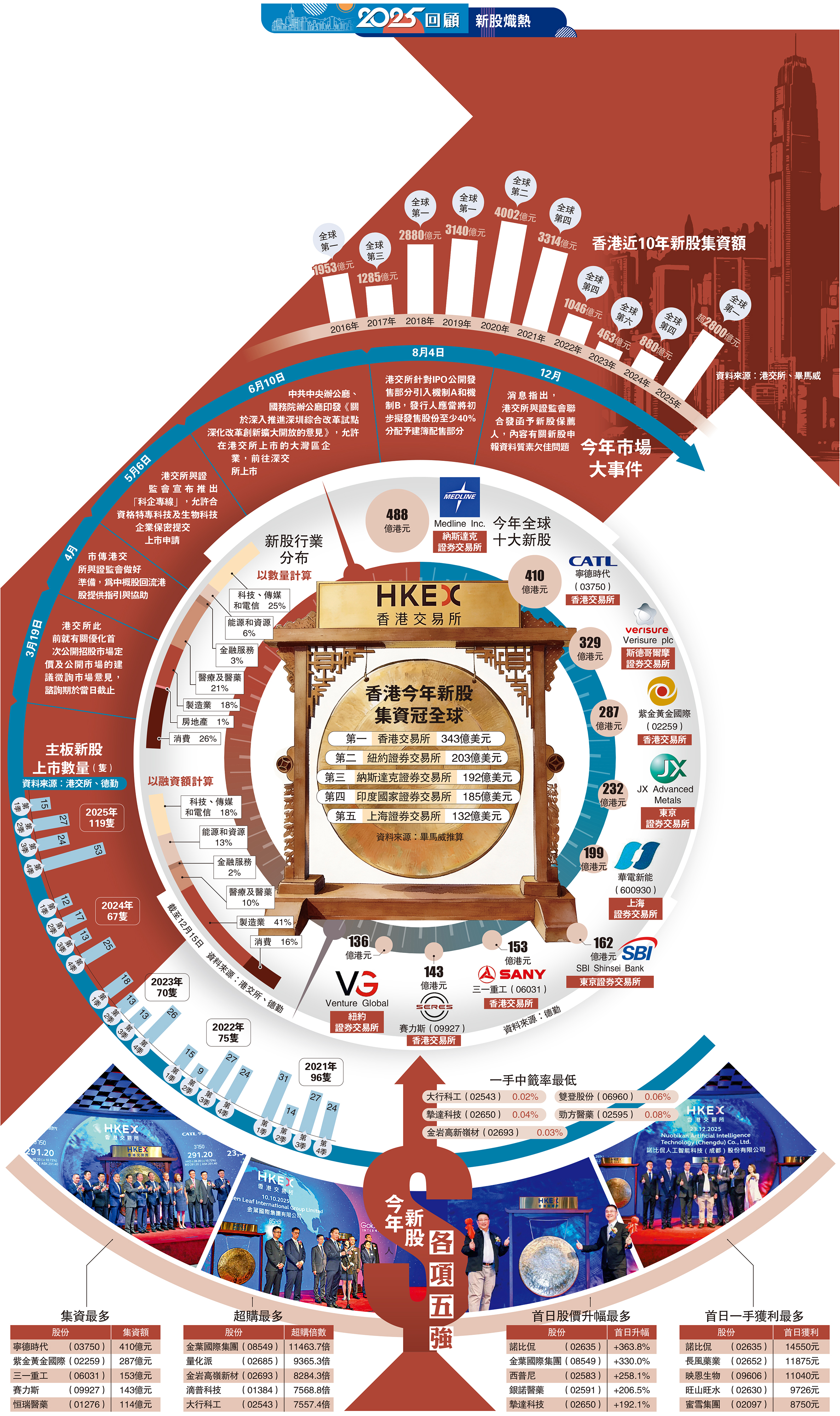 今年新股市場表現火熱,全年集資規模實現兩連升,截至12月30日已錄得逾2800億元,為2022年以來新高,其中四成集資額來自前五大新股,包括寧德時代(03750)、紫金黃金國際(02259)、三一重工(06031)、賽力斯(09927)及恒瑞醫藥(01276),合計集資額已高達1107億元。