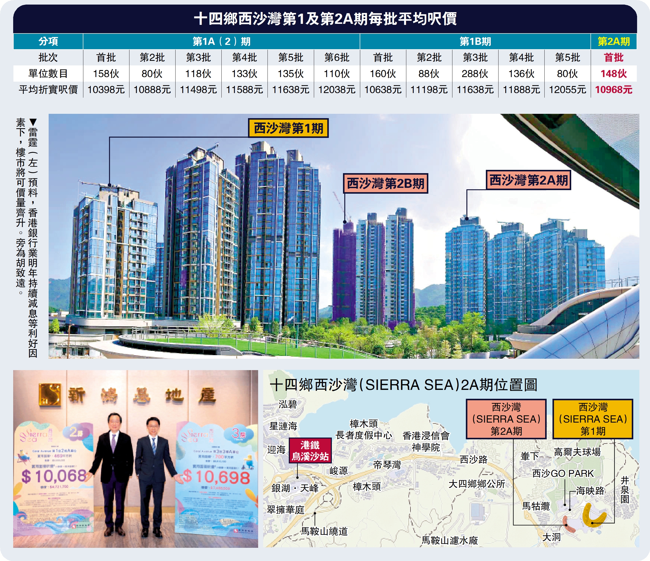 不過,若以首批單位的平均折實呎價計,第2A期的平均呎價約10968元,較第1A(2)期高若5.5%,較第1B期則高約3.1%。新地副董事總經理雷霆指出,今批單位的售價較第1期上調逾5%,而第1期近期的二手成交價已較當時買入價上升10%至20%,相信今次售價仍有吸引力。他續說,今年新盤及二手市場交投皆暢旺,住宅租金亦已破頂,續吸引投資者買樓收租,銀行明年又料持續減息等利好因素下,市場的樓市信心已恢復,相信明年可價量齊升,新地亦繼續積極研究競投土地發展。