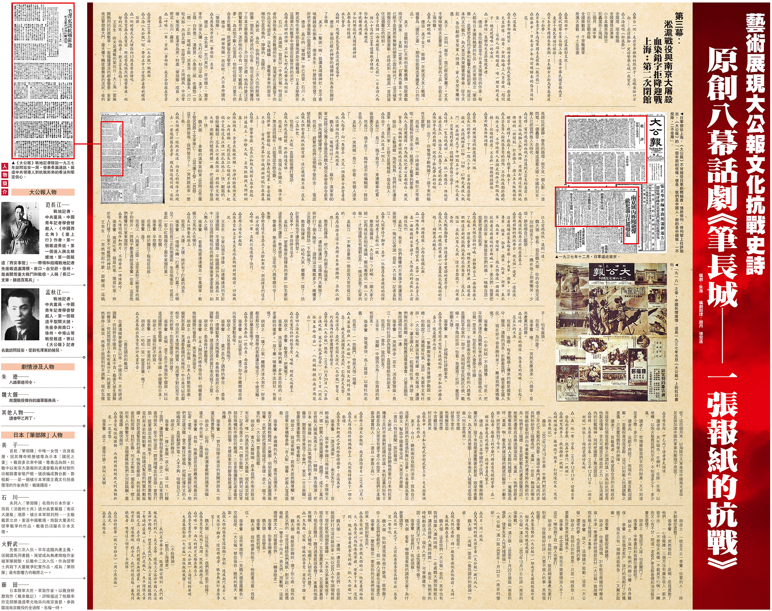 △張季鸞畫外音,宣讀《大公報》上海閉館的聲明。大屏幕投影出《大公報》原版報紙截圖──