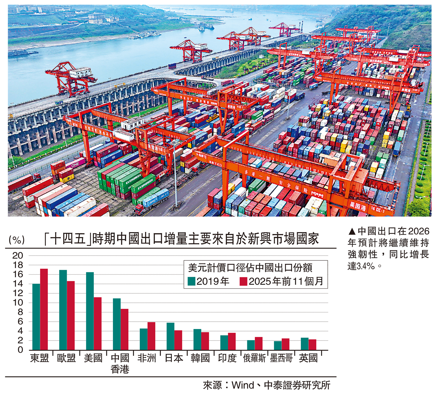 中國出口「以價換量」策略,儘管帶來了貿易摩擦風險,但也會繼續提升中國出口佔全球的份額,令中國出口維持強韌性。2023年1月到2025年9月,以美元計價的中國出口價格指數下跌了17.3%,同期非洲和中東、拉丁美洲、除中國外的亞洲新興經濟體以美元計價的出口價格指數,分別下跌了6.5%、上漲2.1%和上漲3.7%。