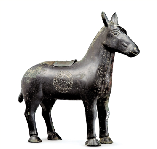 一九五五年,考古學家在陝西眉縣發現了這件珍寶。盠駒尊全身線條流暢,馬駒形態天真而沉穩,彷彿凝固了生命轉折的剎那。駒頸部、胸前有銘文九行九十四字,蓋銘三行十一字,詳細記錄了周王親臨主持「執駒禮」的盛況:某年閏月甲申日,貴族「盠」家獲周王賞兩匹馬駒。貴族「盠」接受賞賜後,稱頌周王並沒有忘記像他這樣的小貴族。這段珍貴史料也為後人揭開了西周禮樂文明的一角。
