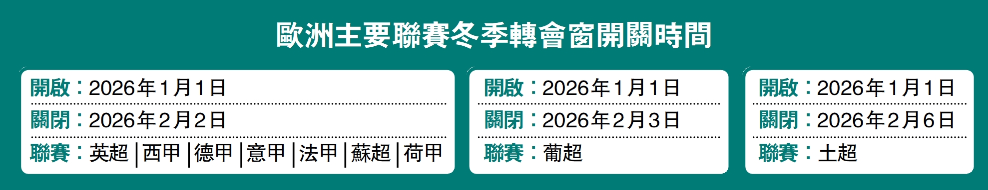 歐洲主要聯賽冬季轉會窗開關時間