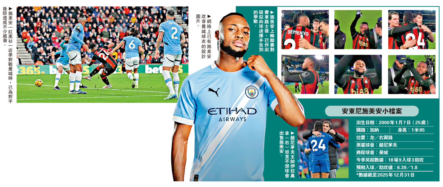 踏入2026年1月,歐洲球壇冬季轉會窗宣告「開市」,而當刻最搶手必屬般尼茅夫翼鋒安東尼施美安,英國傳媒近日已廣泛報道,曼城已接近啟動施美安合約中的6500萬鎊(約6.6億港元)解約金條款,這名即將26歲的加納國腳可能完成本周六英超主場對阿仙奴賽後便正式「入城」。外界估計曼城期望施美安可重演上季巴黎聖日耳門季中羅致翼鋒基華拉斯基利亞後,即奪當屆歐聯的故事。\大公報記者 譚德龍
