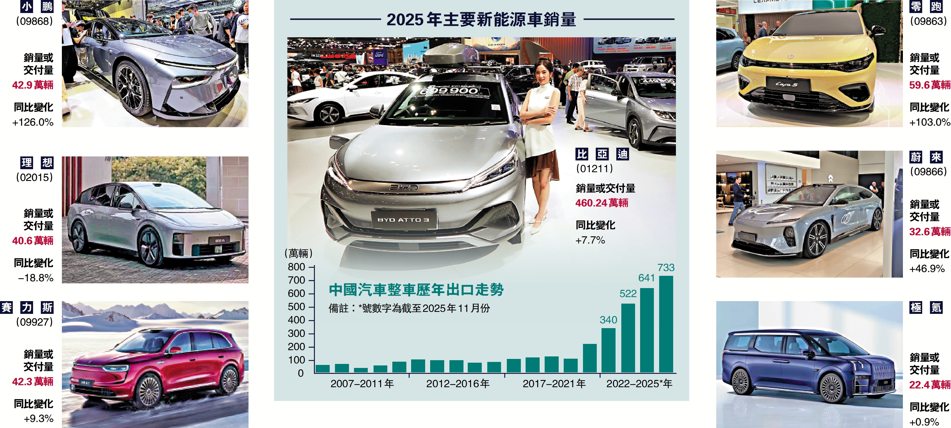 2025年已落幕,各新能源車企相繼公布去年交付量。以量計算,新能源車一哥比亞迪(01211)以460.2萬輛之銷量,保住冠軍之位,但增速僅7.7%;若以增幅百分比計,小鵬(09868)以126%之增速,居新能源車企之首,零跑(09863)以103%增幅居亞軍,交付量為59.6萬輛,至於理想(02015)則不理想,跌18.8%,但累計交付量為新勢力中首間超150萬輛。展望今年,部分車企雄心壯志,零跑董事長朱江明透露,銷量目標為100萬輛。\大公報記者 李 信