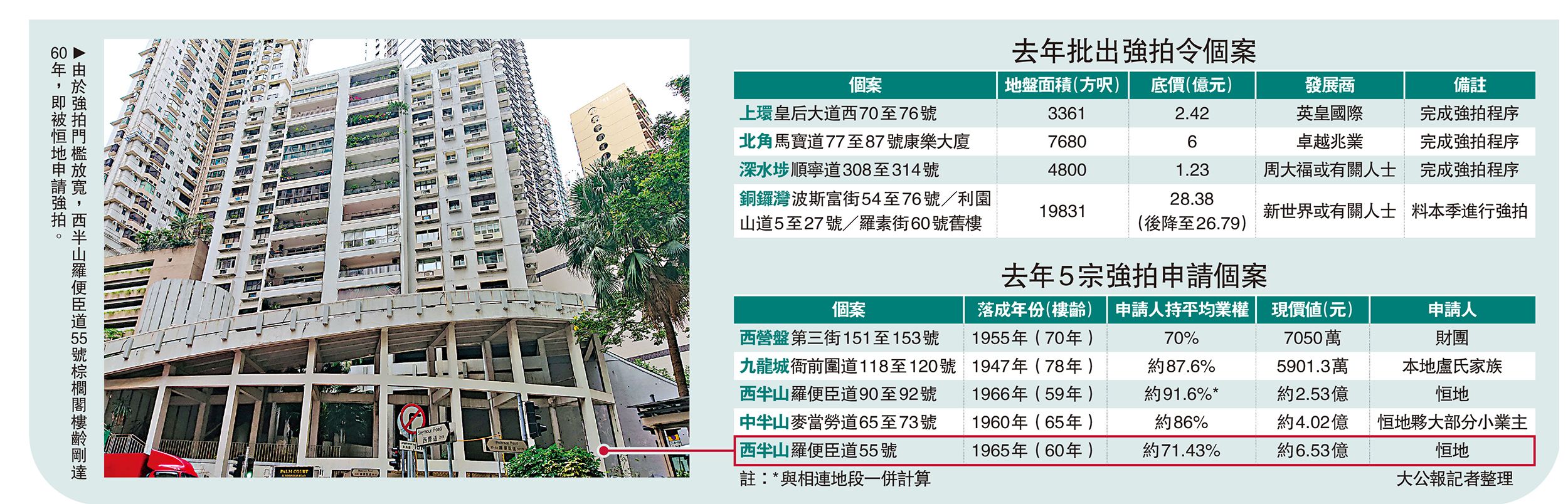 去年的5宗申請,大部分受惠於上述修訂。例如,恒地申請的西半山羅便臣道55號棕櫚閣,在非指定地區,然因其樓齡剛達60年,並持有71.43%,遂符合申請資格。