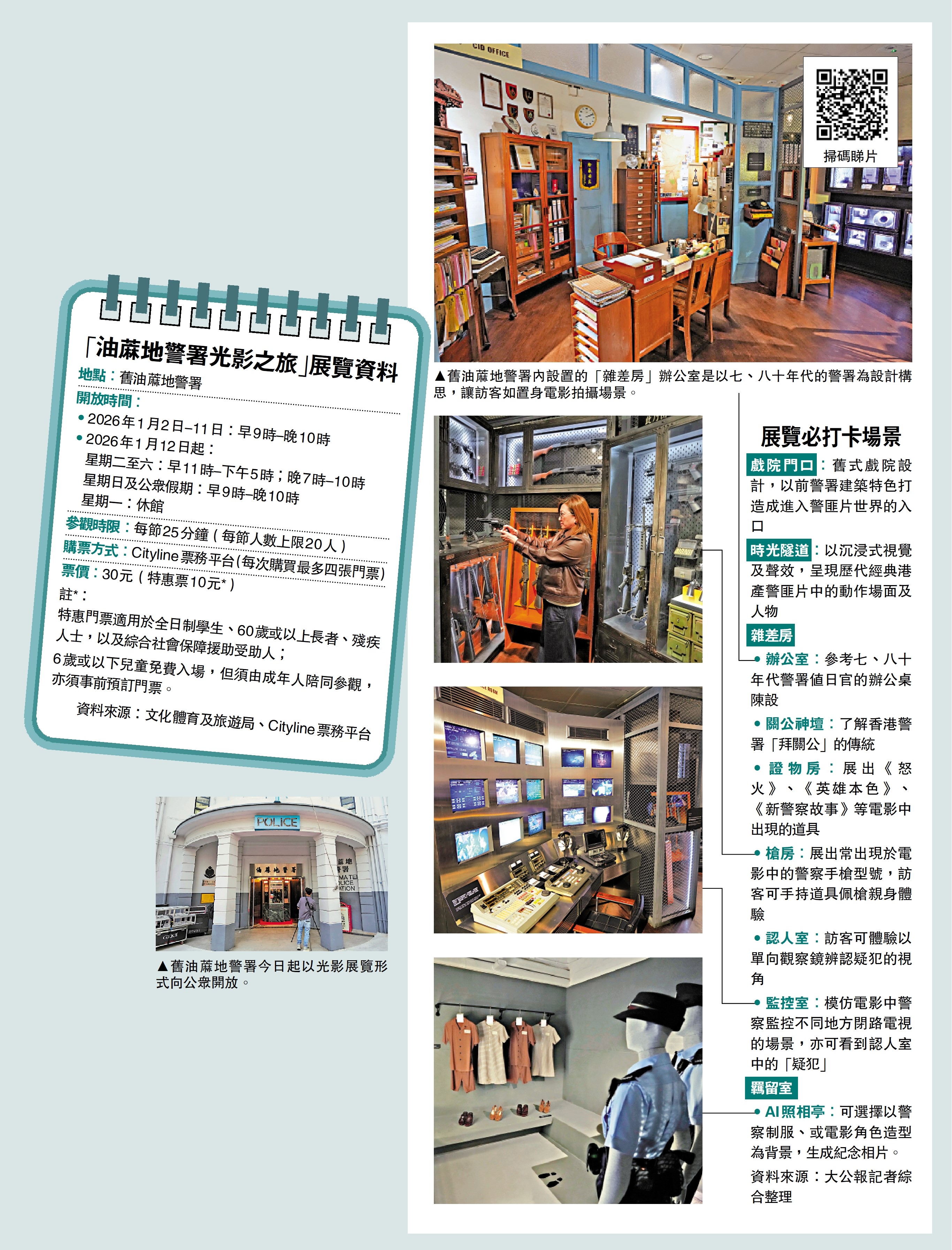 因經典港產警匪片而大受旅客歡迎的舊油蔴地警署,今日起以光影展覽形式向公眾開放,首三日各時段門票已幾乎售罄。警署於昨日下午舉辦展覽開幕儀式,四大打卡場景率先曝光,由舊戲院入口穿過電影時光隧道,即可進入雜差房內的槍房、監控室、認人室等,訪客可了解警署「拜關公」的傳統、持仿真道具槍打卡,亦可在首度開放的羈留室內,以警察或電影角色留下AI紀念相片。政務司副司長卓永興昨日致辭表示,日後展覽範圍將繼續擴充,希望豐富電影文化與旅遊結合的體驗。\大公報記者 王亞毛(文) 林良堅(圖)