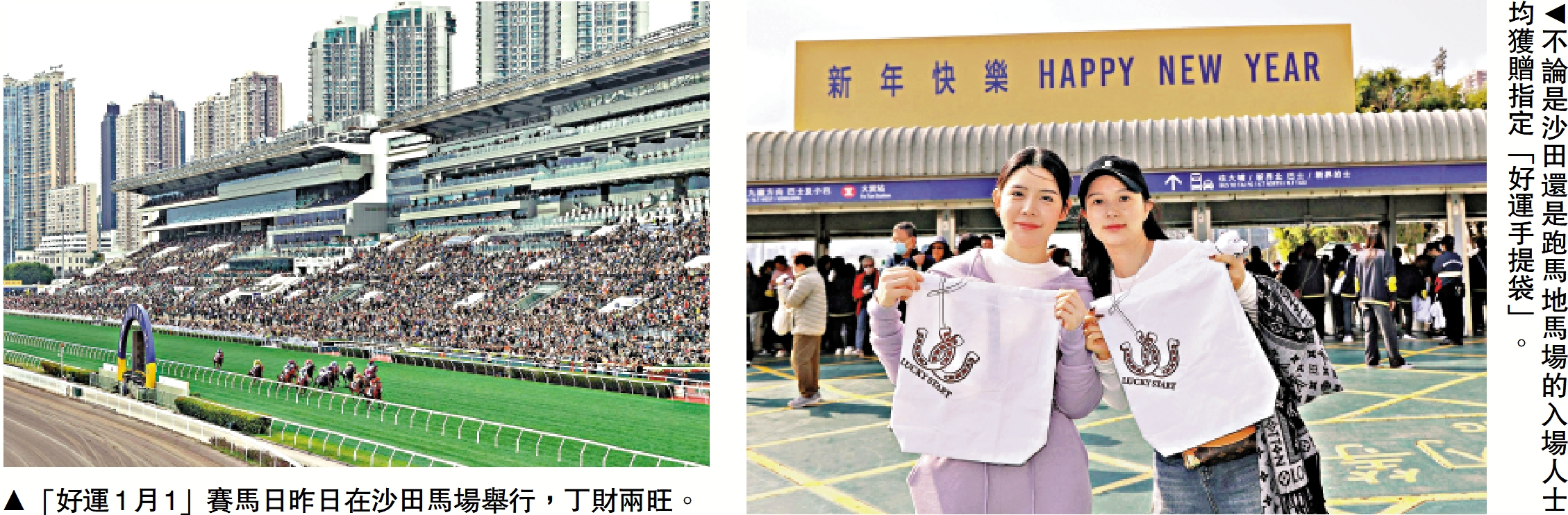 「好運1月1」賽馬日昨日在沙田馬場舉行,不論是沙田還是跑馬地馬場的入場人士均獲贈指定「好運手提袋」。除了賽馬外,現場亦有其他活動,例如「好運由此起問答挑戰」等,參與者可贏取獎品;現場亦設有2026年打卡裝置。