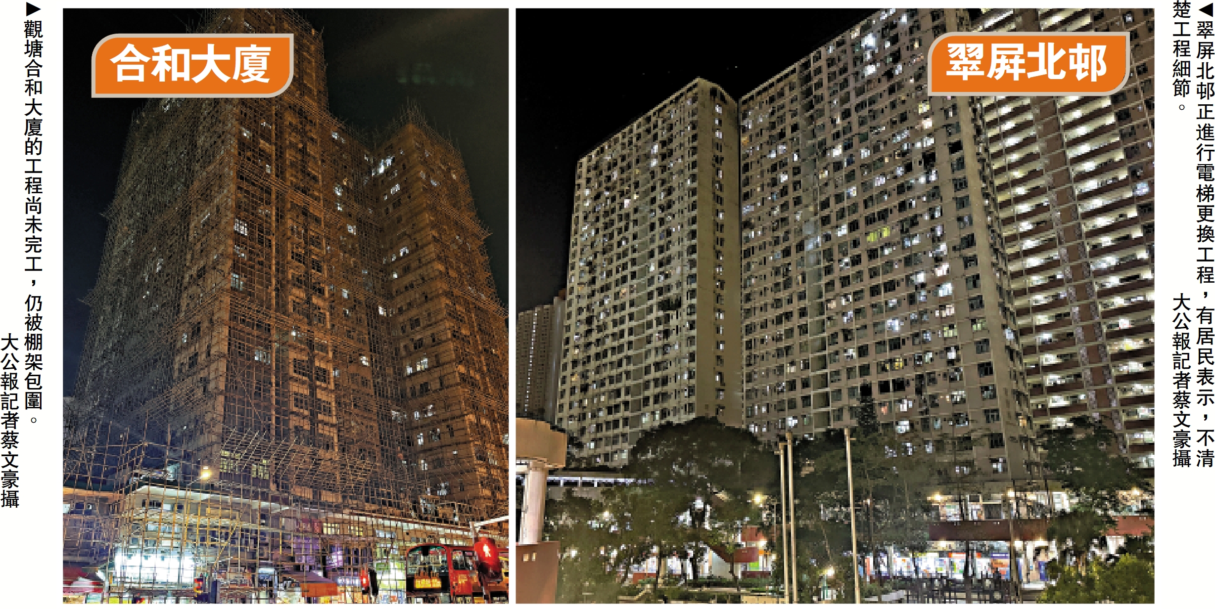 大公報記者昨日到兩個屋苑了解,其中位於觀塘協和街的合和大廈,有近六十年樓齡,400多個單位。現場所見工程尚未完工,大廈仍被棚架圍住,有業主表示工程已進行一部分,尚欠外牆喉管維修。