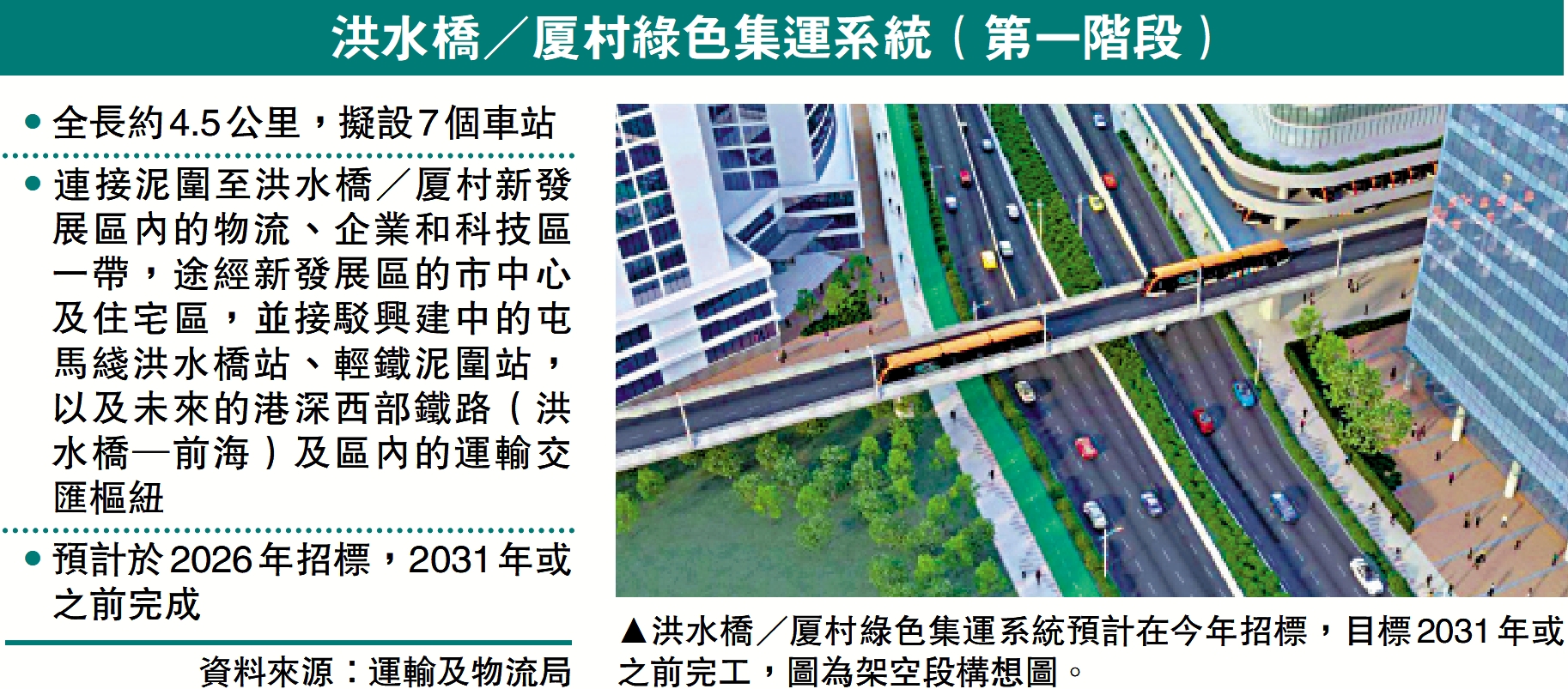 北部都會區基建發展全速推進,政府昨日刊憲授權進行洪水橋/厦村新發展區智慧綠色集體運輸系統(第一階段)道路工程,項目終於拍板上馬。系統首階段全長約4.5公里,擬設7個車站,連接泥圍和洪水橋/厦村新發展區內的物流、企業和科技區及住宅區,預計在今年招標,2031年或之前完工。