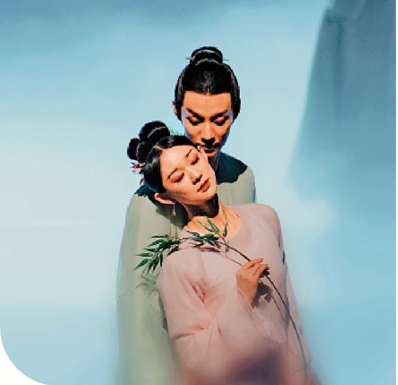 在下部,「畫卷」中柳夢梅對畫中杜麗娘的倩影魂牽夢縈,翩躚舞步描繪書生的痴情;整個舞台以流動的水霧和光影營造氤氳氛圍,舞者曼舞其間。杜麗娘與柳夢梅的雙人舞將湯顯祖筆下「生者可以死,死可以生」的意境演繹出來,兩人的情感在舞台上得以重逢呈現。