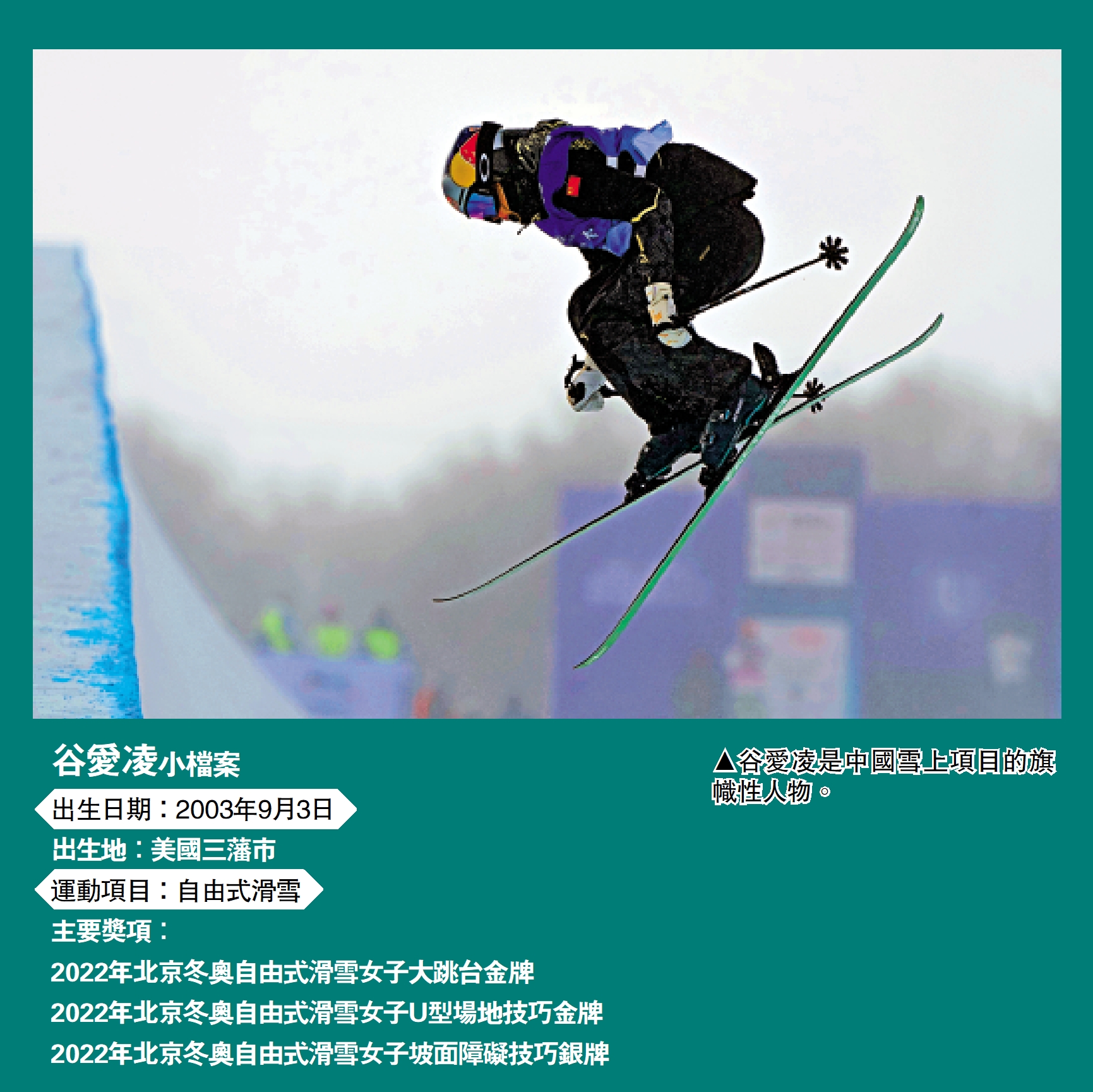 與蘇翊鳴一樣,谷愛凌也是中國雪上項目上的旗幟性人物。在北京冬奧會上,首次參加奧運會的谷愛凌展現出強勁實力,奪得大跳台和U型場地共兩枚金牌,並在坡面障礙技巧項目上奪得銀牌。特別是在女子大跳台項目,谷愛凌首次挑戰此前從未做過的兩周空翻左轉偏軸轉體1620度動作,並成功完成這一動作,奪得這枚意料之外的金牌。敢於冒險、敢於挑戰的精神,是她屢次突破自我極限的基礎,但隨之而來的是訓練和比賽的受傷。