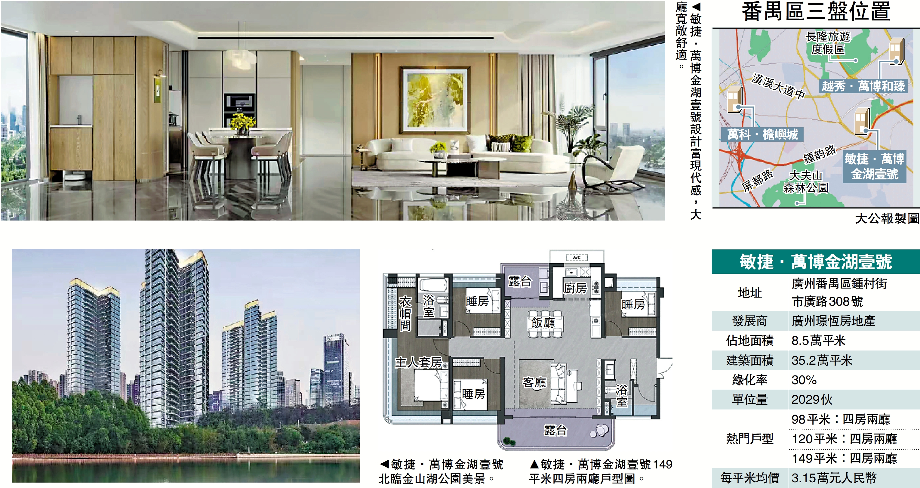 位於番禺萬博CBD核心的敏捷·萬博金湖壹號,共15幢住宅樓,提供2029伙,主打單位全數為湖景四房戶,有助吸引換樓客。\大公報記者 帥誠廣州報道