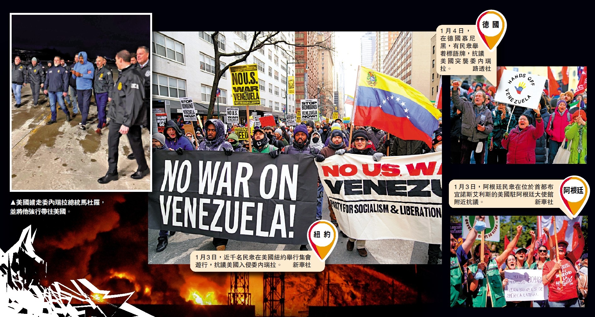 美軍3日悍然入侵委內瑞拉,抓走委總統馬杜羅夫婦,美國總統特朗普當天稱,美國將「管理」委內瑞拉直至實施「安全」過渡。美媒預計,馬杜羅最快於5日在紐約出庭,面臨毒品恐怖主義等指控。美國無視國際法的霸道行徑,引發全球怒吼。美國國內逾百城市3日舉行大規模示威,全球多國民眾周末上街抗議美國霸權行徑。