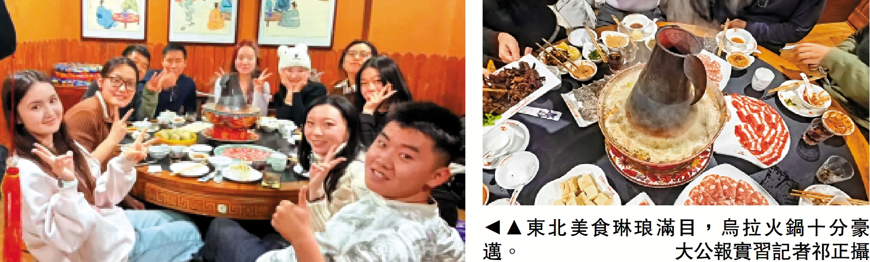鍋包肉酸甜酥脆,大拉皮Q彈爽口,烏拉火鍋熱氣騰騰,各類餃子鮮味十足……在吉林省的數天裏,香港傳媒學子除了通過參觀各類自然人文景觀了解東北,還用各式各樣的美味佳餚「品嘗」東北。