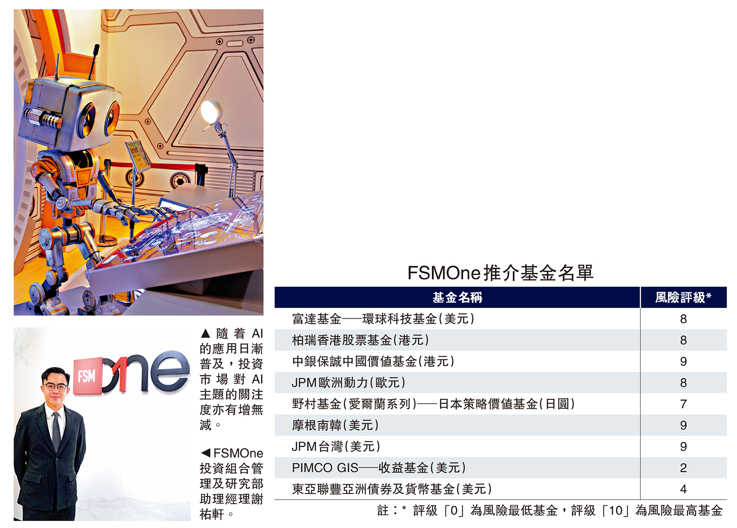 投資市場對人工智能(AI)主題關注度有增無減,FSMOne投資組合管理及研究部助理經理謝祐軒指出,因應AI投資主題,投資者可以關注受惠於AI發展的市場,例如中國內地、中國香港、中國台灣、韓國等。此外,歐洲、日本市場亦值得留意。