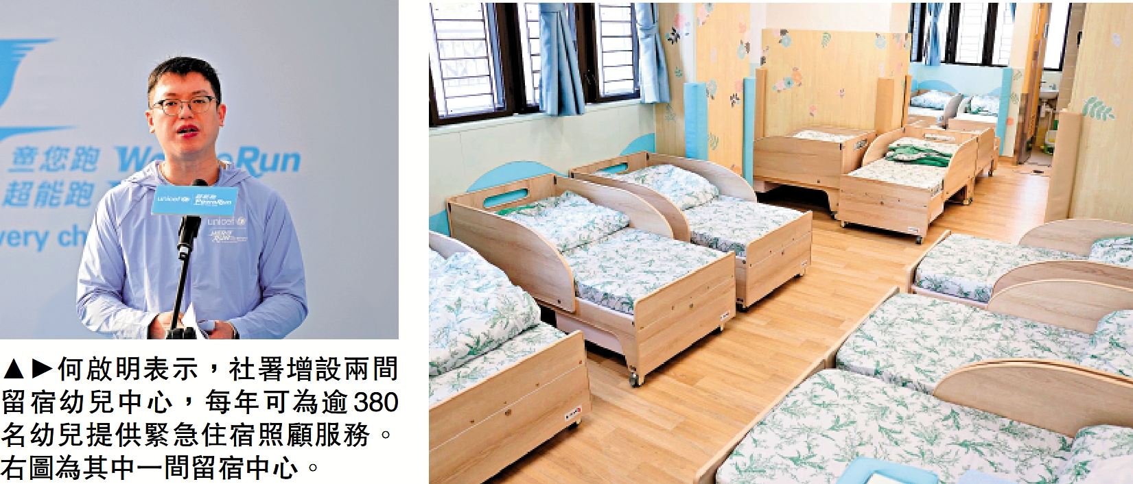何啟明昨日出席活動致辭時表示,為應對《強制舉報虐兒條例》生效後,可能會增加舉報虐兒個案,社署已增設兩間留宿幼兒中心,每年可為逾380名幼兒提供緊急住宿照顧服務。為在源頭預防虐兒,社署將以試驗形式,成立四間社區親子中心,以遊戲為本的方式,促進親子互動及教育家長正向育兒的方法,支援有親職需要的家庭。4間親子中心將於今年陸續投入服務,預計首年受惠人數共四萬人。
