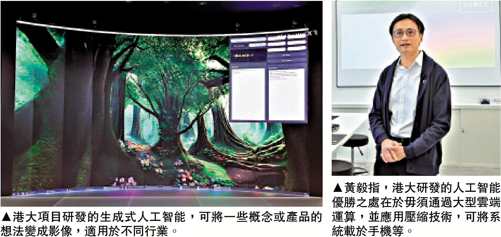 其中香港大學電機電子工程系成功研發生成式人工智能,可透過語音指令實時生成三維場景,適合各行業應用於設計、介紹等。黃毅表示,這款生成式人工智能,可將一些概念或產品的想法變成影像,由無到有。他說,技術特別適合各行業應用於介紹,以至遊戲設計等。