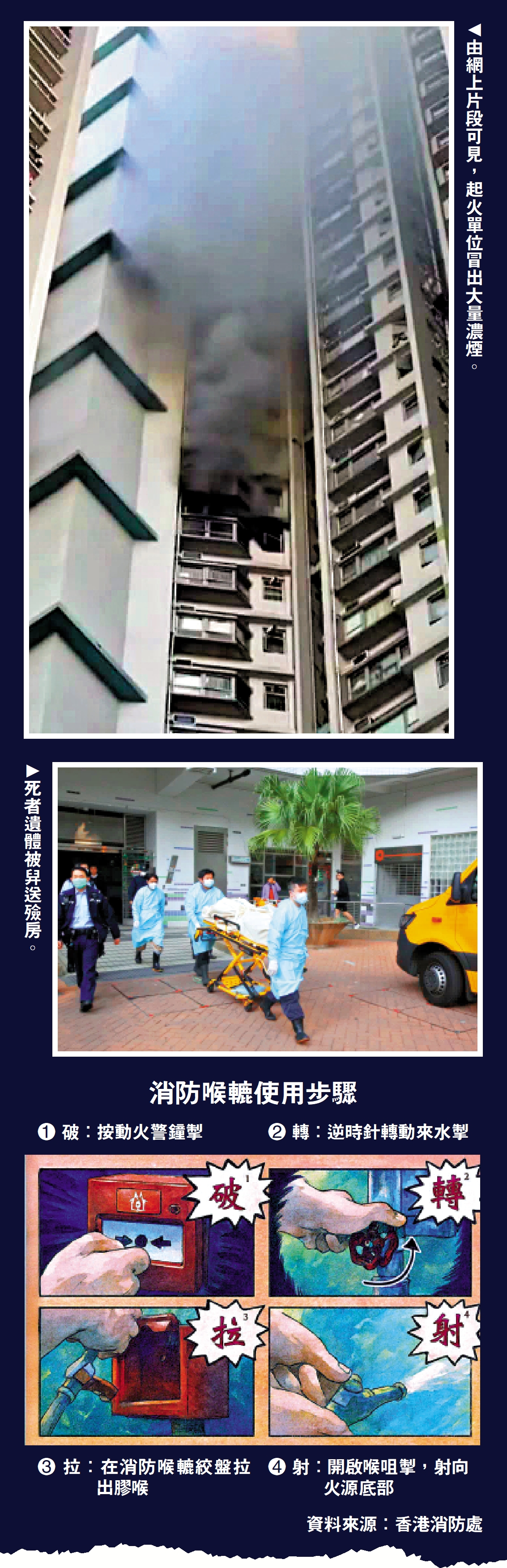 對於有居民反映21樓的消防喉「無水出」,消防處指大廈消防裝置及設備運作正常,提醒居民要熟習使用消防設備。有居民和消防顧問均認為要加強公眾消防知識教育。\大公報記者 易曉彤