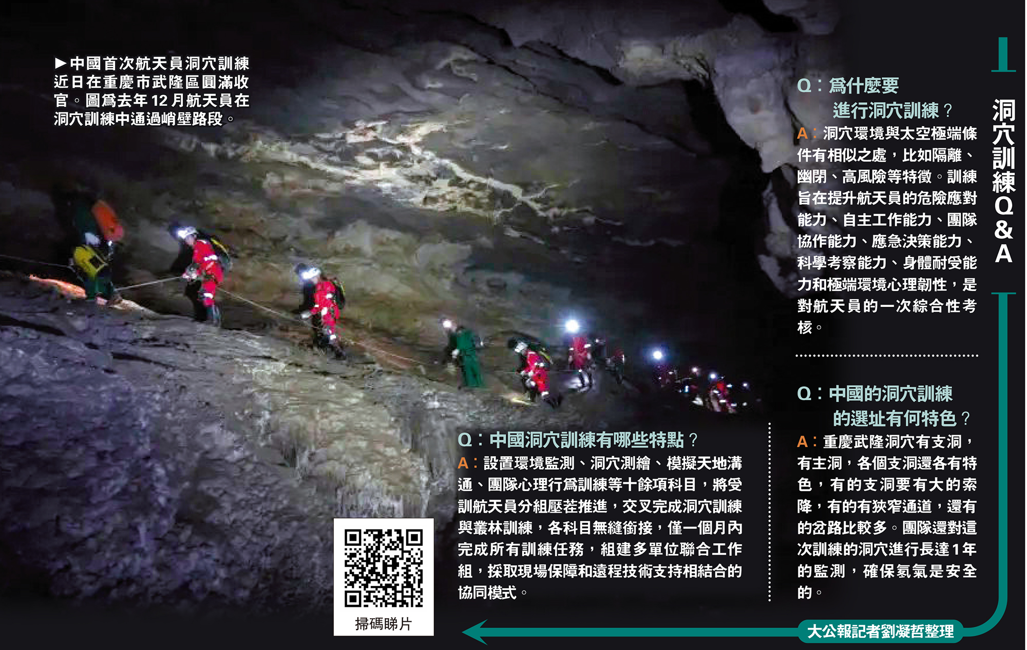 中國計劃在2030年前實現載人登月,目前各系統正在按計劃推進中。此次洞穴訓練的成功實施,使中國航天員訓練體系向更全面、更貼近實踐的方向邁出堅實一步,對航天員執行空間站更長時間飛行及載人登月任務提供了有力支撐。\大公報記者 劉凝哲北京報道