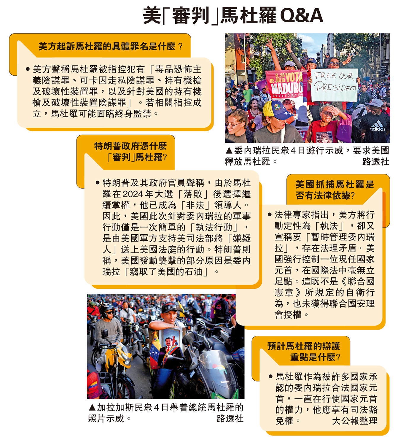 •美方聲稱馬杜羅被指控犯有「毒品恐怖主義陰謀罪、可卡因走私陰謀罪、持有機槍及破壞性裝置罪,以及針對美國的持有機槍及破壞性裝置陰謀罪」。若相關指控成立,馬杜羅可能面臨終身監禁。