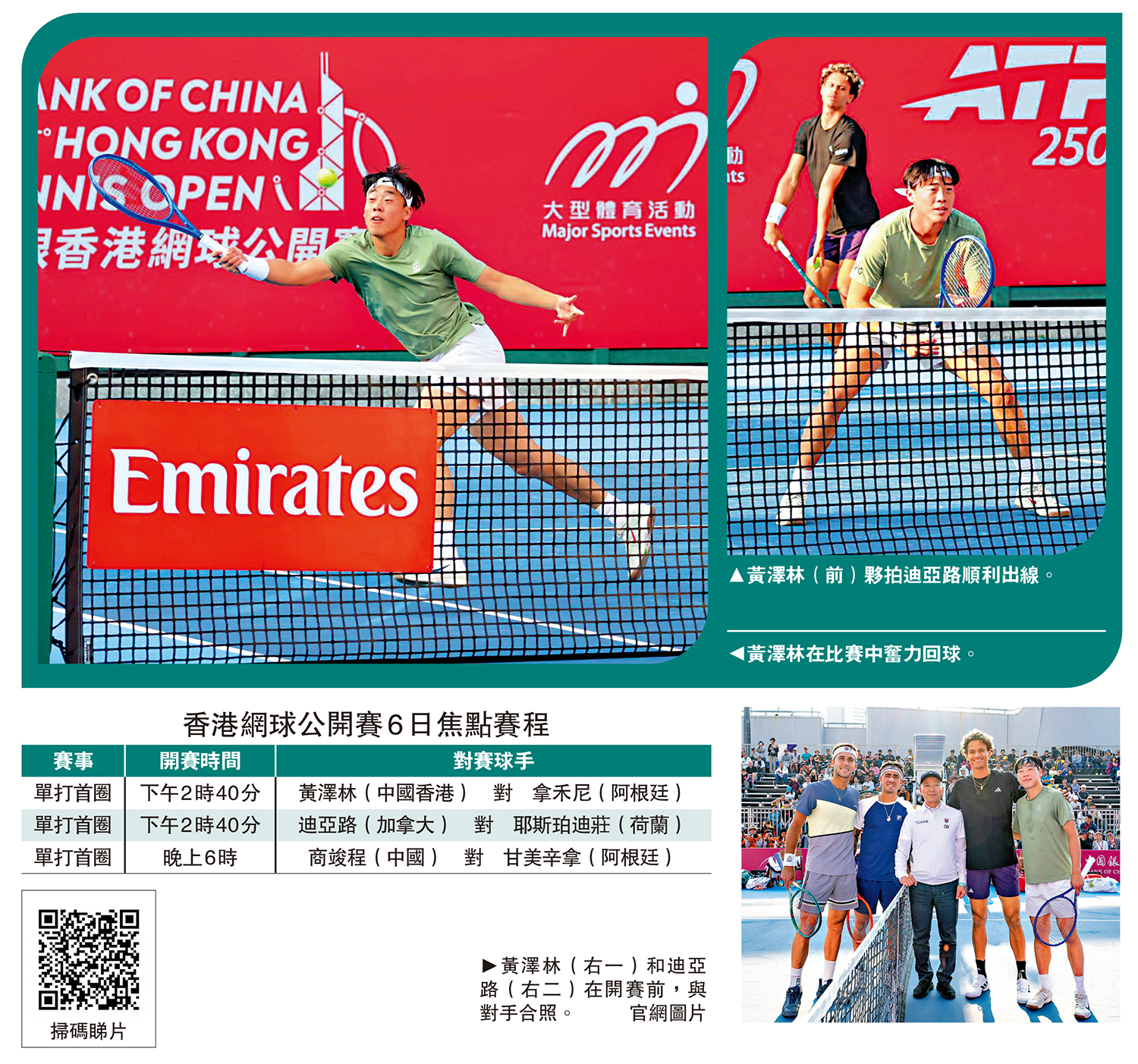 中銀香港網球公開賽5日在銅鑼灣維多利亞公園網球場舉行正賽首天賽事,中國香港網球「一哥」黃澤林夥拍加拿大球手迪亞路在雙打首圈對陣阿根廷組合甘美辛拿/伊治維尼,最終黃澤林/迪亞路力戰下以7:6(7)、3:6、10:6取勝,躋身次圈。6日下午2時40分,黃澤林將在單打首圈對陣阿根廷球手拿禾尼,爭取晉級。\大公報記者 朱家立(文、圖)