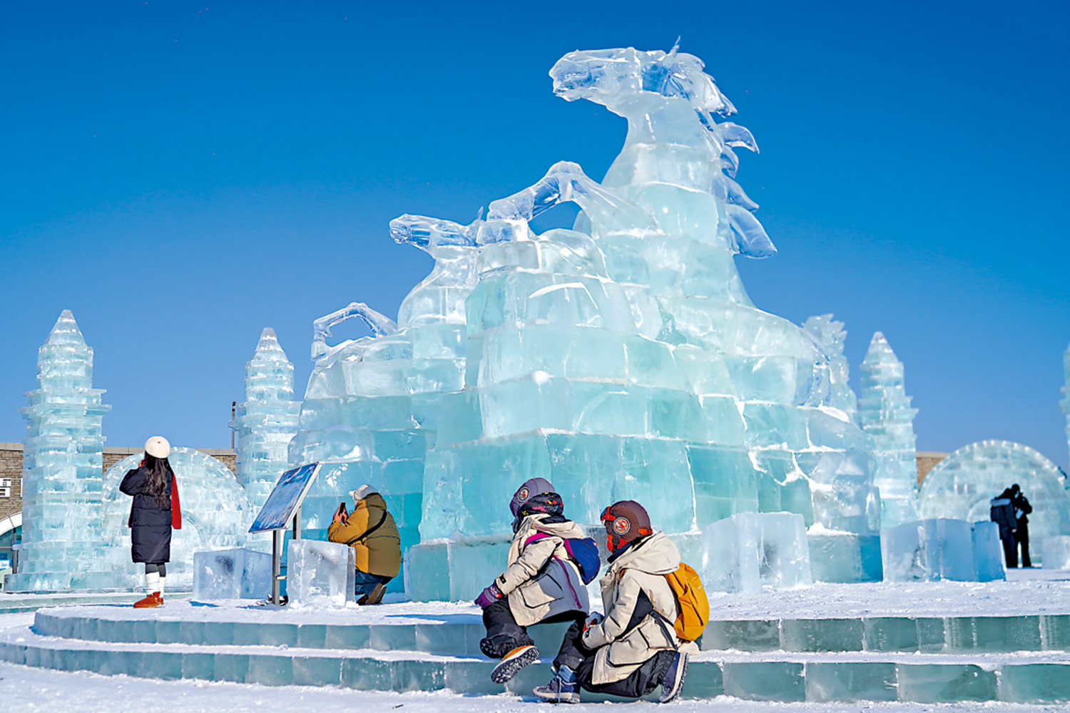 黑龍江哈爾濱,遊客打卡冰雪大世界內的「冰雕馬」,為即將到來的農曆馬年討個好彩頭。\中新社