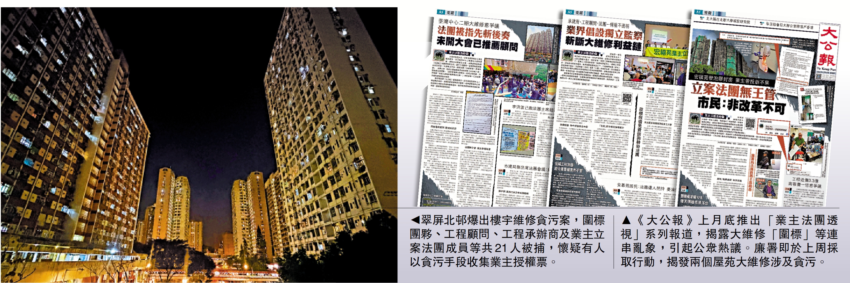 《大公報》在上月下旬推出「業主法團透視」系列報道,揭露不少大廈管理的問題,包括大維修出現「圍標」、小業主投訴無門;現時強制驗樓「30年大限」如何更切合不同個案的需要等,希望社會更關注大維修及法團的問題,令市民更能安居樂業,報道引起公眾熱議,並於多個平台廣泛轉發,至上星期廉署採取行動,揭發兩個屋苑大維修涉貪污,包括屋苑業主立案法團成員被捕。