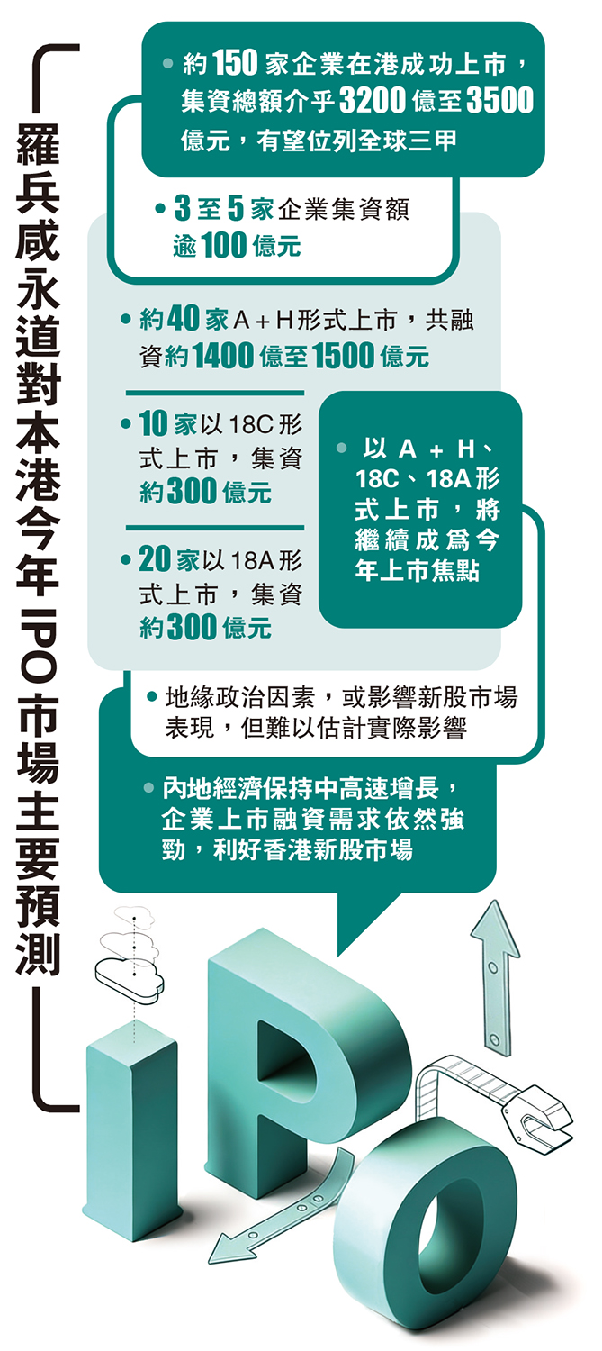 •約150家企業在港成功上市,集資總額介乎3200億至3500億元,有望位列全球三甲