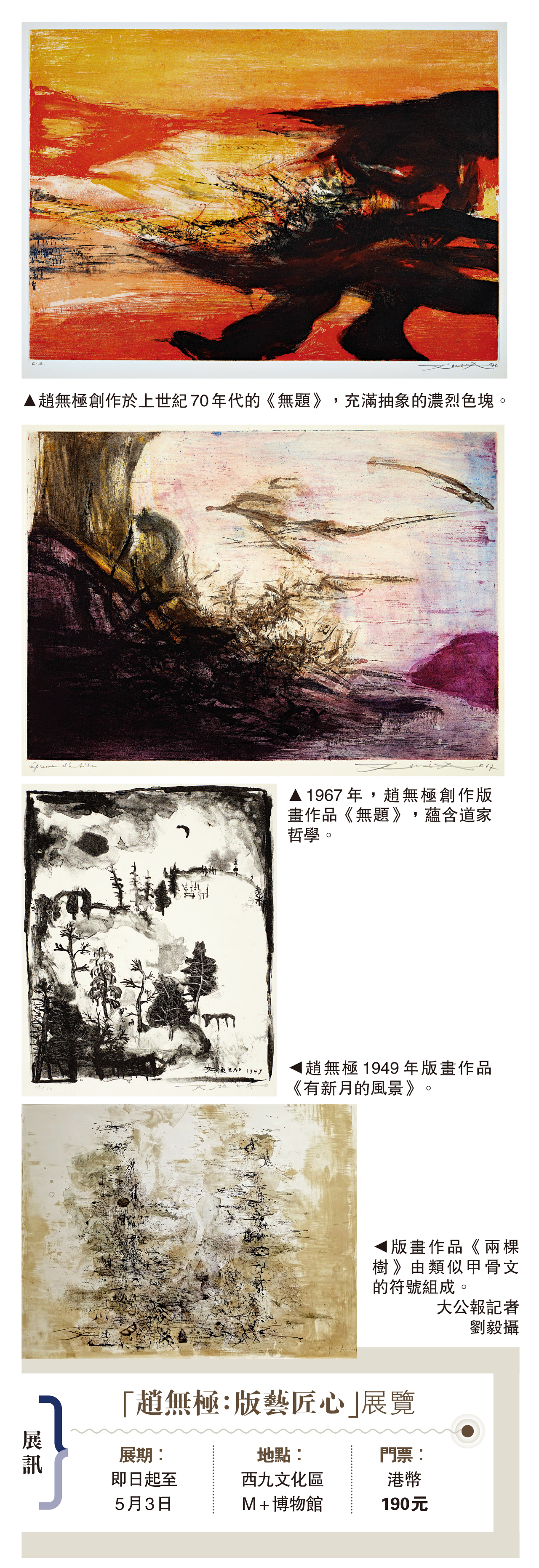 作為20世紀中後期享負盛名的抽象藝術大師,趙無極自1948年移居巴黎,融入當地藝術圈,次年開始創作版畫,並將之形容為「幾乎像是遊戲」,比油畫更有趣味、難預料。亞洲首個聚焦趙無極版畫作品的大型回顧展「趙無極:版藝匠心」正在香港M+博物館展出,展覽以近180件畫作回顧趙無極50年版畫創作歷程,見證其從具象走向抽象,以及版畫作為他藝術創作的試驗場,如何成為連接中外文化美術之橋。\大公報記者 劉 毅
