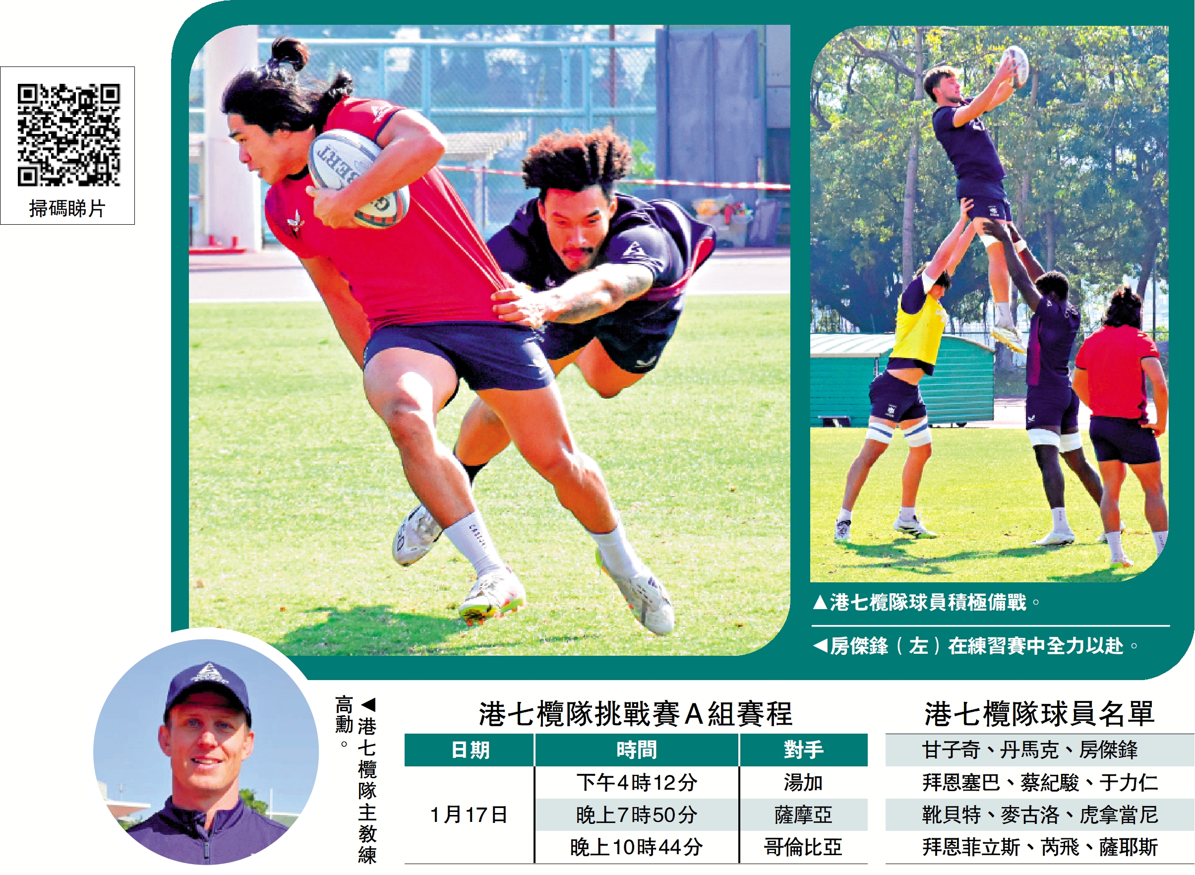 房傑鋒分享了備戰細節。他提到,球隊在假期中仍保持自主訓練,整體狀態良好。與以往備戰過多聚焦心理層面不同,本次備戰更注重技術細節,他說:「我們嘗試不要給自己太大壓力,純粹回歸欖球本身,多講技術上的東西。」對於同組對手,房傑鋒分析,薩摩亞和湯加身體對抗強、節奏快,球隊將以技術應對;哥倫比亞雖是陌生對手,但能擊敗南美強隊智利,證明其絕非弱旅。
