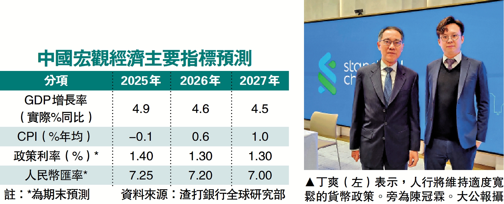 【大公報訊】渣打公布中國宏觀經濟預測,將2026年中國的經濟增長預測,由原來的4.3%上調至4.6%。渣打大中華及北亞區首席經濟師丁爽解釋,主要反映中美之間的關稅摩擦暫緩,以及中國全要素生產率(total factor productivity,TFP)持續提升。