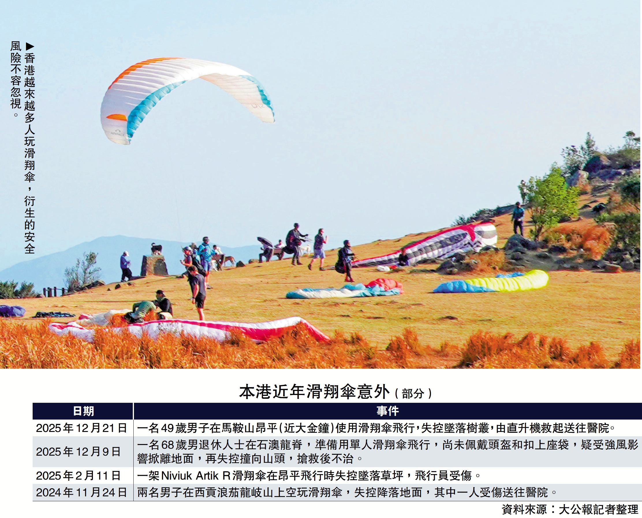 另外,民航處更新《香港航行資料匯編》(AIP),明確劃分滑翔傘的指定飛行空域(八個區域),發布詳細安全指引和宣傳短片,提高飛行員和公眾的認知;儘管民航處已採取多項措施,香港現時仍然並無專門針對滑翔傘活動的獨立法例,過分依賴業界自我管理,導致事故仍時有發生。\大公報記者 伍軒沛