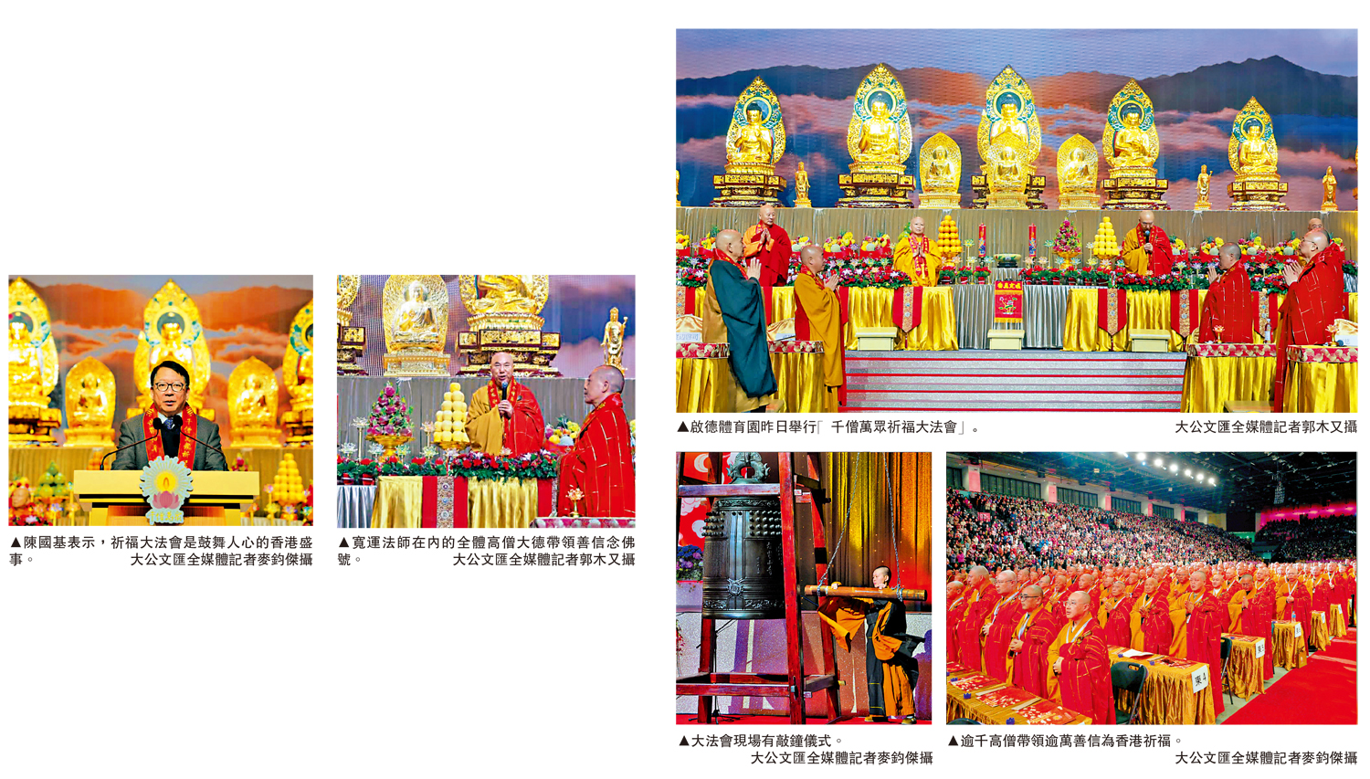 昨日的「千僧萬眾祈福大法會」是「世界和平 國泰民安 千僧萬眾祈福大法會」系列活動的重頭戲,於上午9時30分開始,由身兼大會主席、特區政府政務司司長陳國基,以及中央政府駐港聯絡辦副主任劉光源共同主禮。全港善信熱烈響應,場內座無虛席。