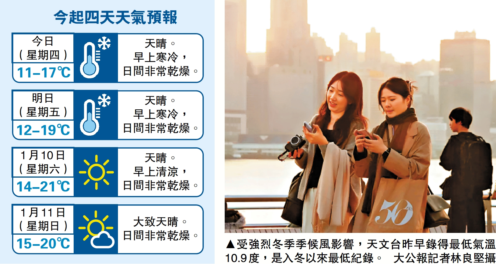 天文台預測,今早寒冷,市區最低氣溫約11度,新界部分地區氣溫顯著較低。日間非常乾燥,最高氣溫約17度。展望明日天晴及非常乾燥,早上仍然寒冷。周末期間氣溫稍為回升,但早上天氣清涼,下周初部分時間有陽光及乾燥。