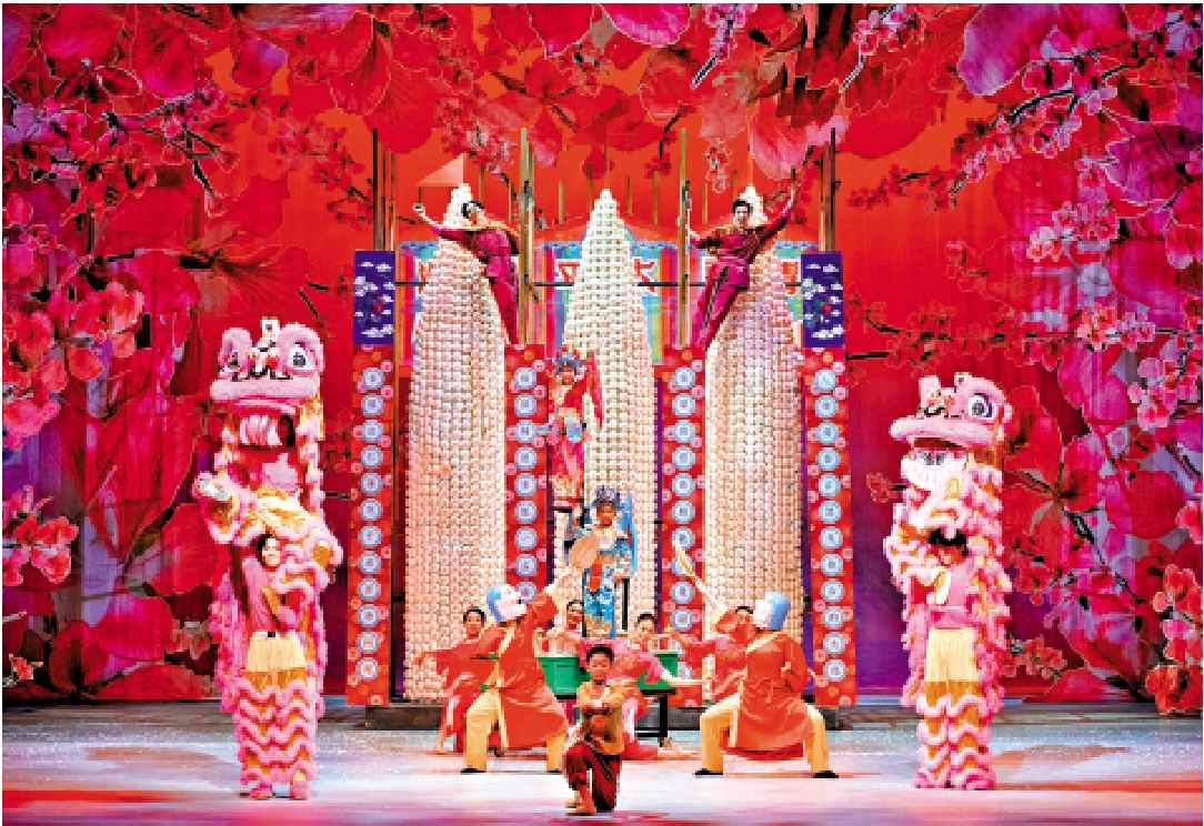 然而,當舞會承載了過多「被展示」的文化意象,其敘事功能亦隨之被稀釋。福祿壽、皮影戲等元素接連登場,更像是被依次置入舞台,而非由情節自然引出。三位西方芭蕾舞演員的舞段亦以基礎動作為主,其存在更多是維持舞會結構的完整,而非推動故事向前。舞會最終形成一個視覺資訊密集的場面,卻未能真正建立起清晰的戲劇動力。
