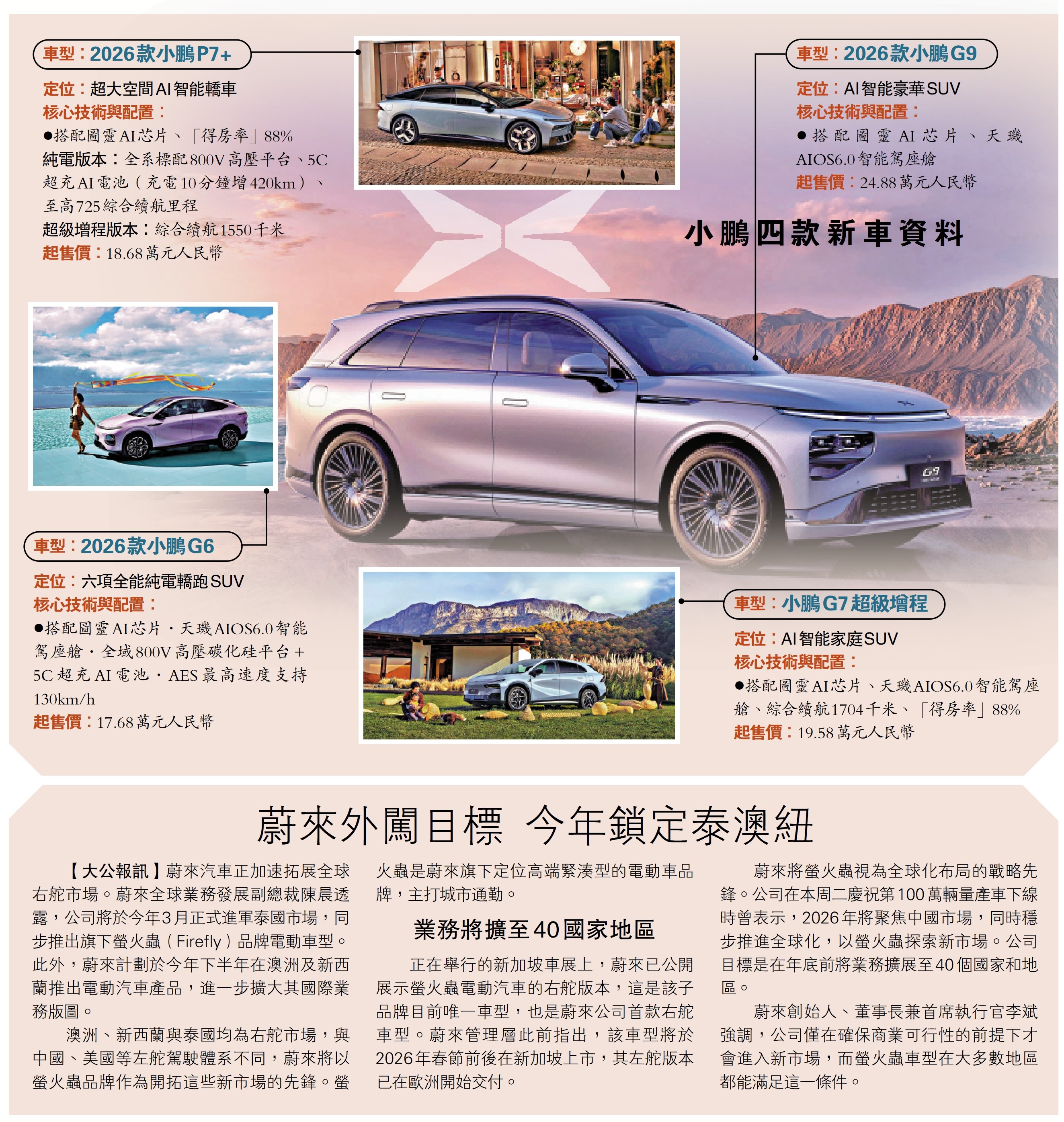 內地車企去年銷售報捷,新年伊始已紛紛出手爭奪市場。小鵬汽車(09868)於昨日舉辦新品發布會,一次性推出四款新車型,包括小鵬G6純電版、新款小鵬G9純電版、小鵬G7增程版,以及小鵬P7+純電與增程版。