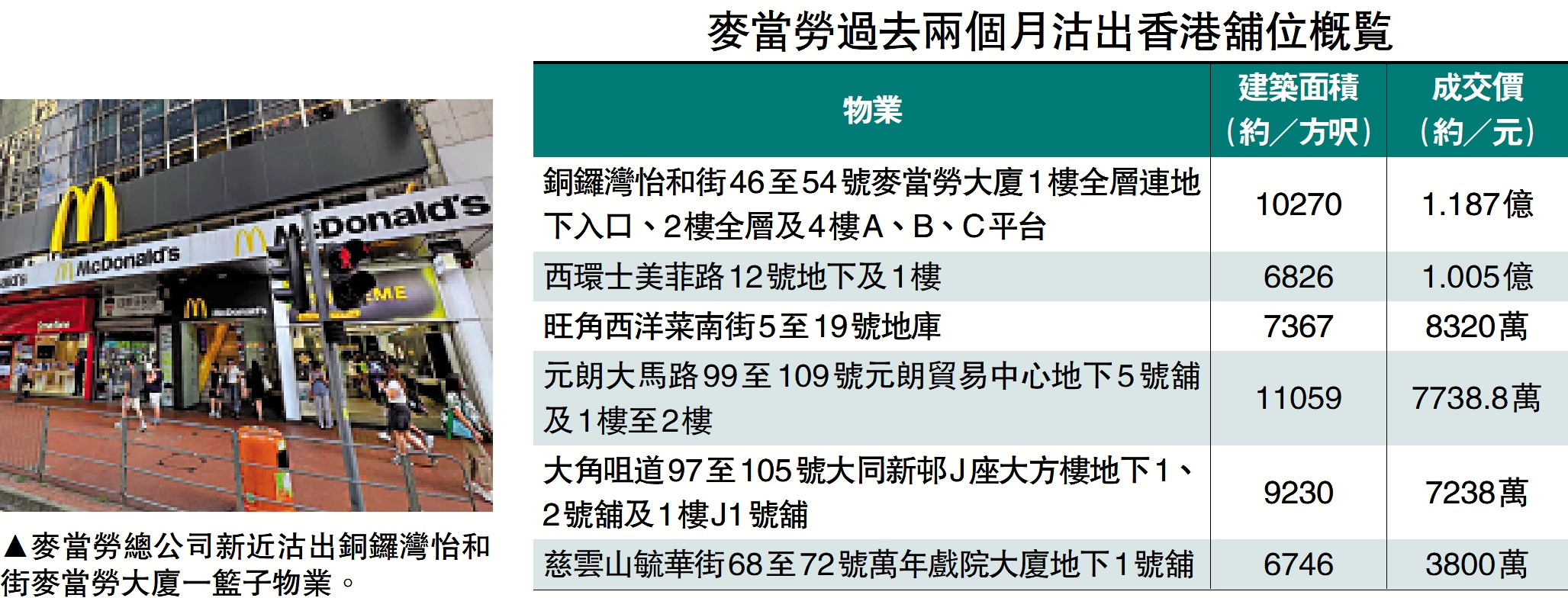 【大公報訊】本港零售氣氛回暖,連租約的優質商舖,吸引投資者加快承接。美式連鎖快餐店麥當勞美國總公司放售的舖位持續獲吸納,其中位於銅鑼灣核心地段的怡和街麥當勞大廈一籃子物業,以約1.187億元沽出,令集團短短約兩個月累計連沽6個舖位,套現約4.9億元。