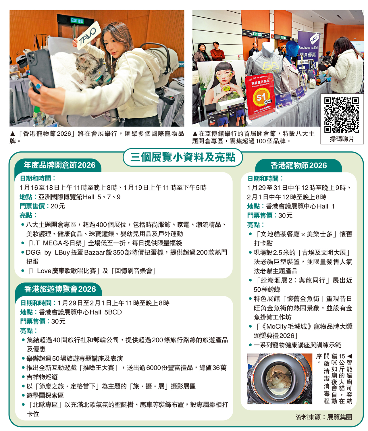 1月盛事齊發,三大消費及主題展覽將接連舉辦,包括首度舉辦的「年度品牌開倉節2026」,以及載譽歸來的「香港旅遊博覽會2026」和「香港寵物節2026」,帶來多元化的購物、旅遊及娛樂體驗,三場展覽在整個1月聯合發放總值超過3000萬港元的優惠券和百萬元禮品。有參展商將在開倉節推出超過100個品牌、8000餘件貨品,以低至一折優惠和福袋吸客,對銷情樂觀。展覽集團表示,開倉節是「粵車南下」政策實施後,首個面向大灣區居民的大型零售活動,期望能吸引更多內地消費者來港,刺激本地消費。\大公報記者 易曉彤(文) 麥潤田(圖)