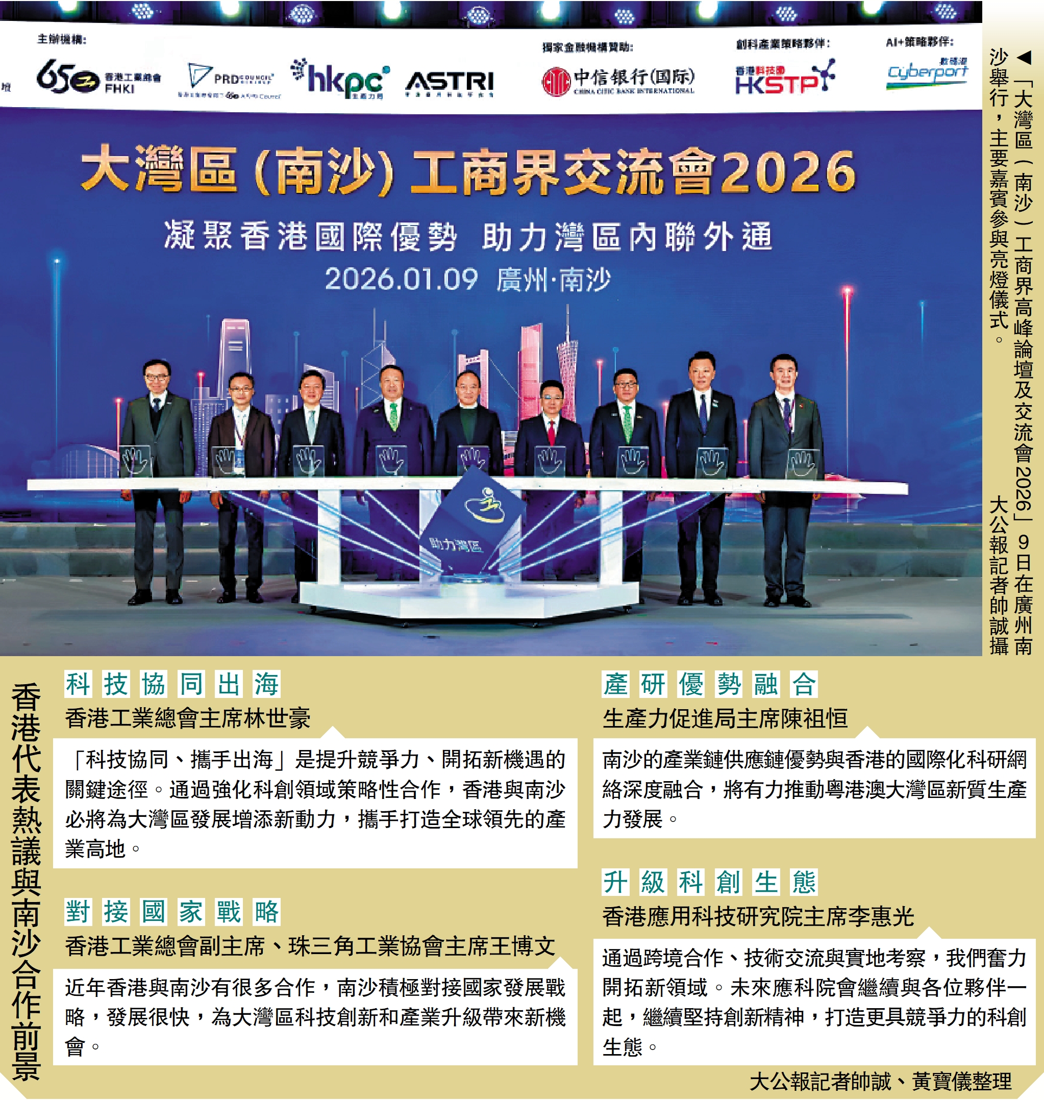 有「千人宴」之稱的「大灣區(南沙)工商界高峰論壇及交流會2026」9日在廣州南沙舉行,活動以「凝聚香港國際優勢 助力灣區內聯外通」為主題,旨在推動粵港澳大灣區新型工業化提質升級,助力企業抱團「併船出海」,加快打造全球領先的現代化產業集群。為進一步深化粵港合作,香港工業總會在交流會上與八個機構及企業簽署合共五份合作備忘錄,提出將促進商貿合作、協助企業落戶香港及併船出海。