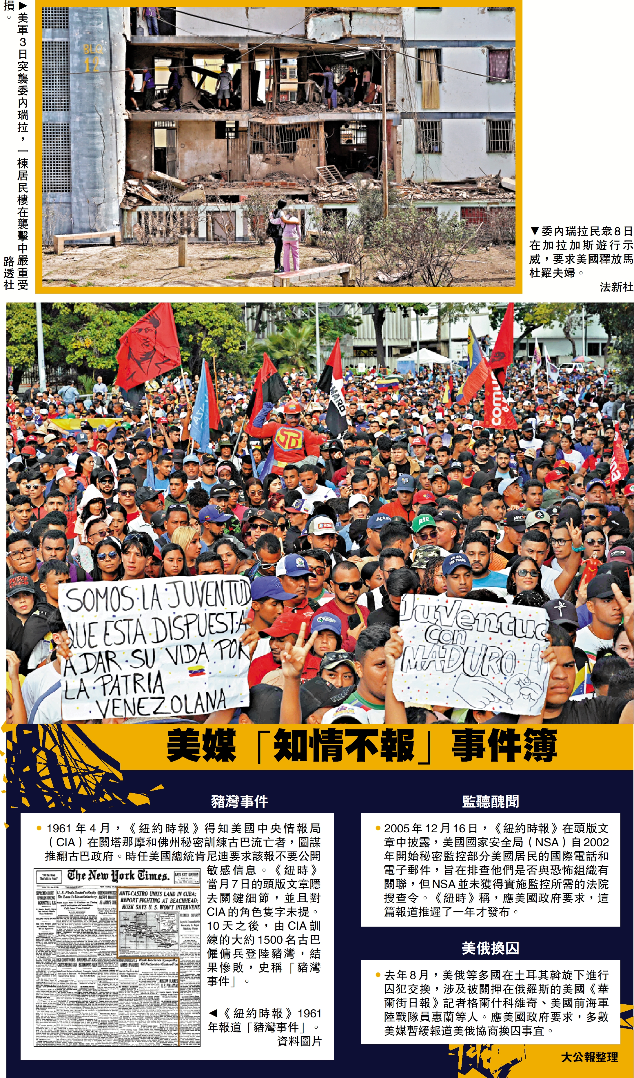 【大公報訊】美國「旗語」新聞社援引知情人士稱,當地時間2日晚間,就在美國準備對委內瑞拉發動秘密突襲之前,《紐約時報》和《華盛頓郵報》提前獲悉了相關消息,但為「避免危及美軍安全」,這兩家媒體決定暫緩發布報道。「旗語」新聞社表示,配合美國官方保密信息是美國長期以來的新聞傳統;即便美國總統特朗普長期不滿傳統媒體之間,在涉及最高風險的國家安全事務上,雙方也依然存在溝通和合作,並遵守「知情不報」的傳統。